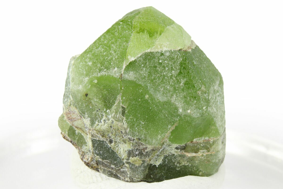 This is a wonderful, .7" wide, green olivine peridot crystal collected from Kaghan Valley in the Khyber Pakhtunkhwa Province of Pakistan. Its white coating is likely chrysolite, an asbestos matrix common in this locality.