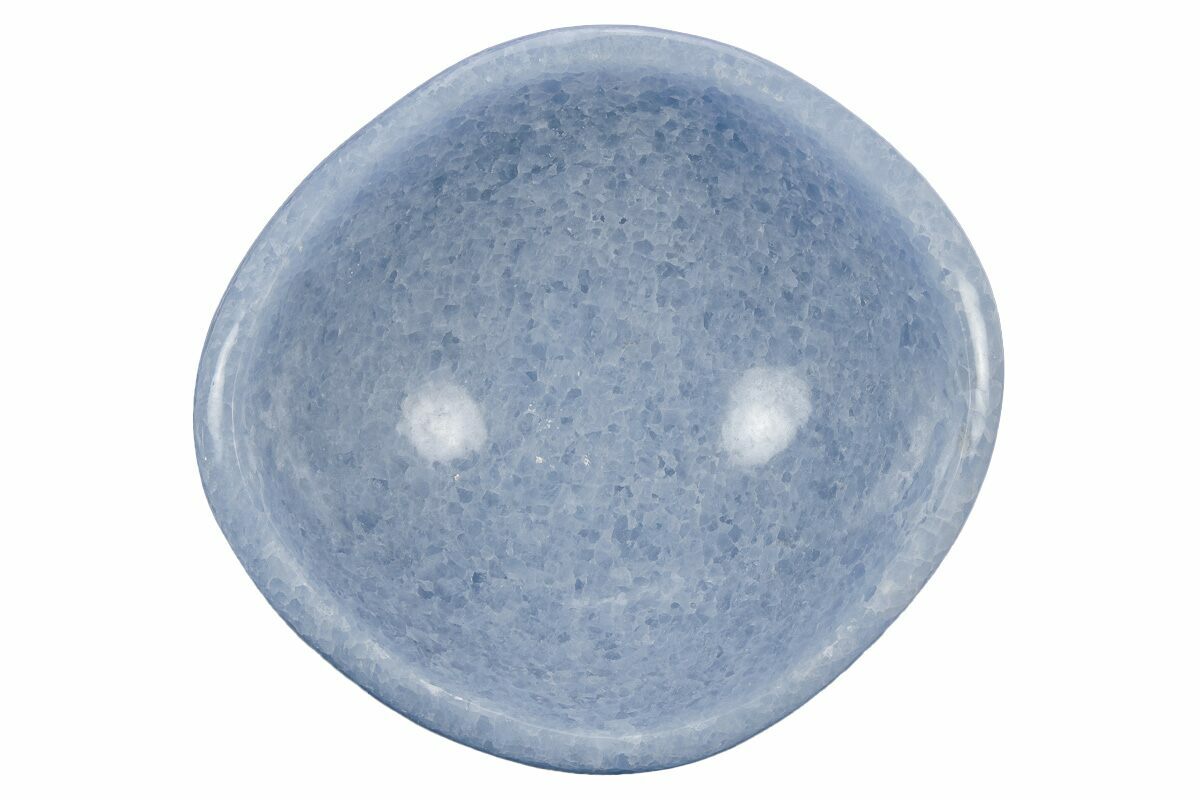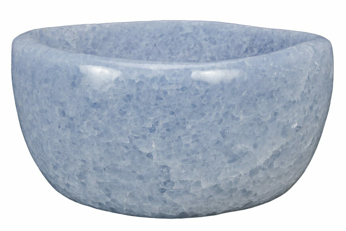 This is a beautiful, polished blue calcite bowl from Madagascar. It has been polished to a glossy finish to highlight the attractive blue color of the mineral.