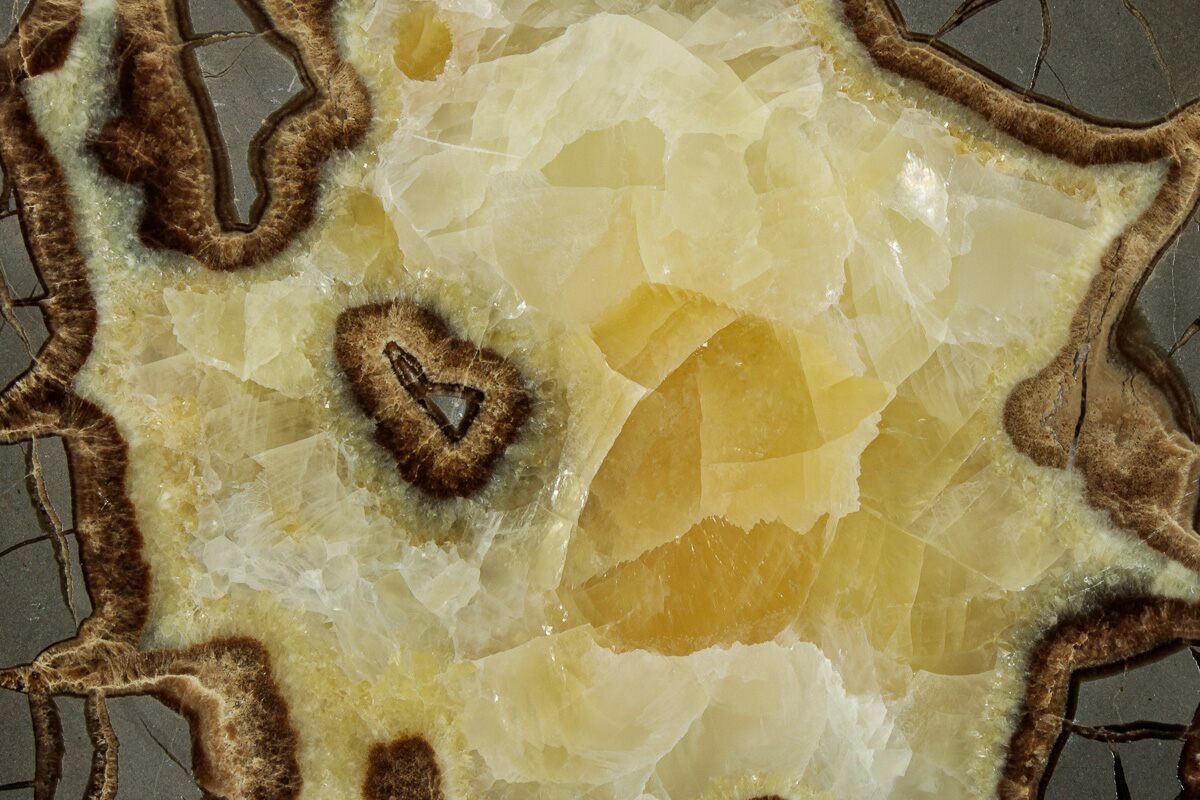 This is a beautiful polished slice from a septarian nodule. This septarian was mined West of Orderville, Utah and was deposited during the Late Cretaceous, about 100 million years ago. The contrast between the grey limestone, yellow calcite crystals, and brown aragonite is quite stunning. It has been polished on one side and displays well on the included display stand.