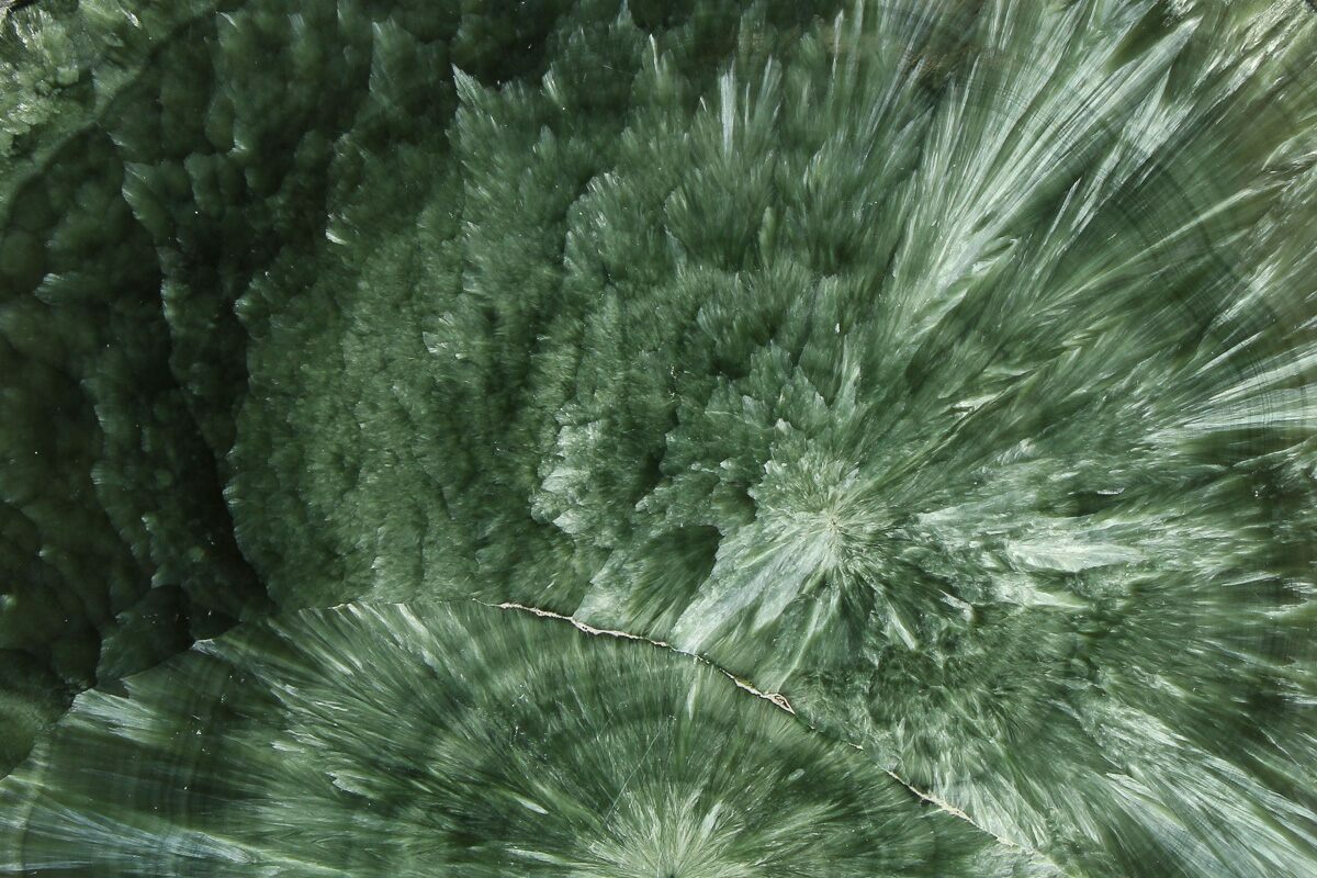 This is a cross-sectional cut slab of spherical seraphinite aggregations, collected from the Korshunovkiy mine (Korshunovskoye Iron Skarn) in Siberia, Russia. It has been polished to a glossy finish, revealing the chatoyant nature of this stunning mineral.