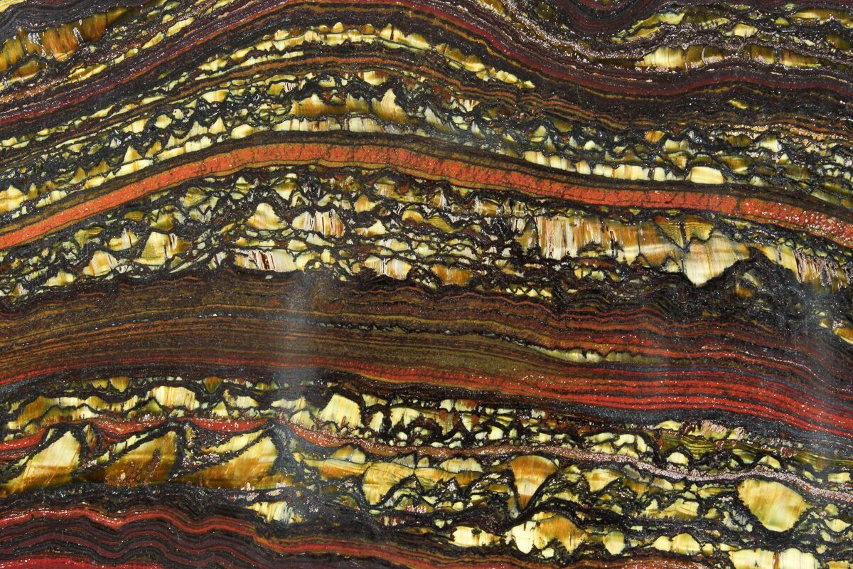 Many believe tiger iron should technically be considered a stromatolite formed by ancient cyanobacteria over two billion years ago. One theory holds that tiger iron is a typical stromatolite that has undergone mineral replacement with iron oxide. Another theory suggests that microbes formed the banded iron directly while the stromatolite was being formed.