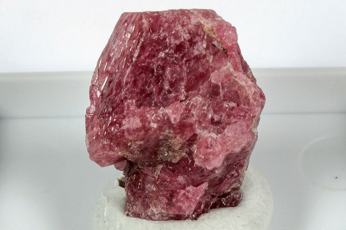 This is a vibrant, cherry-red, .7" wide specimen of natural rhodonite (manganese silicate), collected from Morro da Mina mine in Minas Gerais, Brazil. The rhodonite has been left in its rough state and is accompanied by an acrylic display case and mineral tack.
