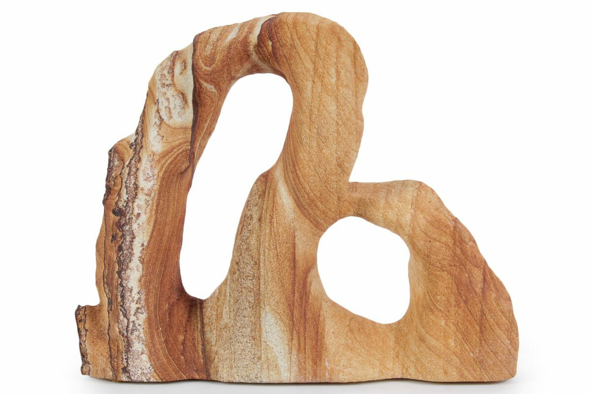This is a 7" wide Toroweap picture sandstone arch. This stunning and distinctive sandstone, mined near Snowflake, Arizona, has been artistically crafted into an arch shape, inspired by natural sandstone formations like Delicate Arch in Arches National Park. The base of this specimen has been cut flat for vertical presentation.