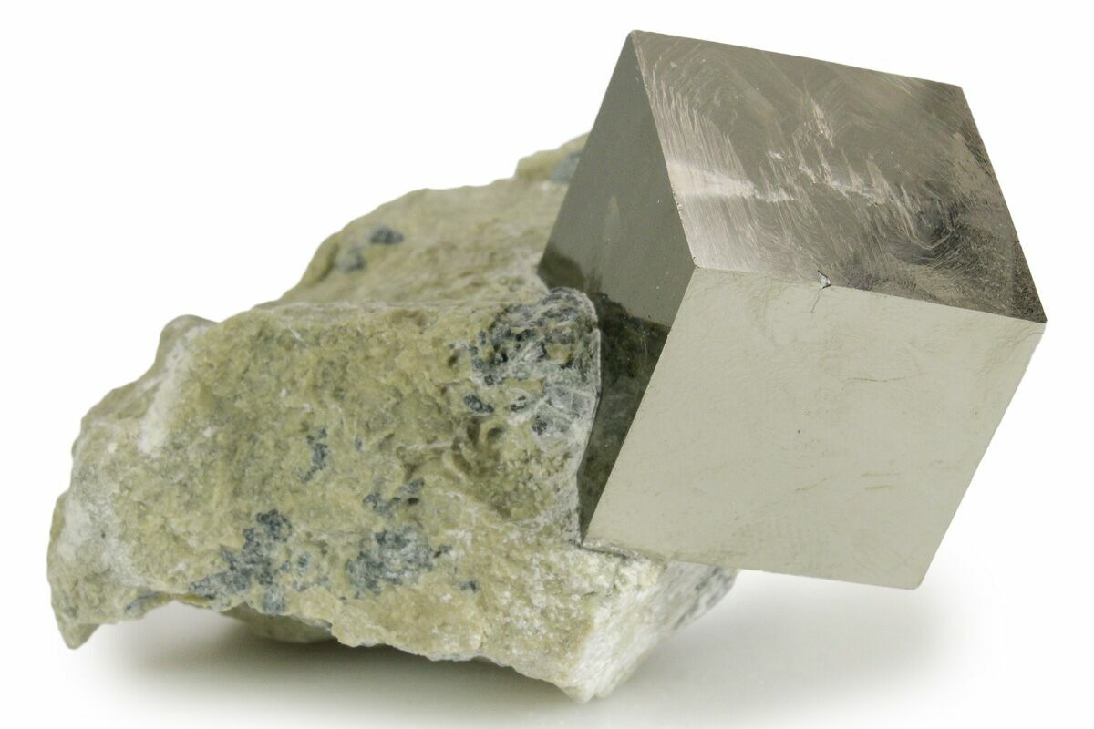 At first glance some people assume that these pyrite cubes are man-made, but the amazing thing is that they are natural! Pyrite from this location is famous for its beautiful shine, near-perfect cubic formation, and sculptural appearance. Because the matrix rock is soft, the cubes often come loose during collection. Care is taken during preparation to stabilize, repair, and make sure everything is remounted in its natural position: no specimens are composites. This means that nearly all of the pyrite cubes still in the rock from this locality have been remounted, and most clusters of multiple cubes have been stabilized.