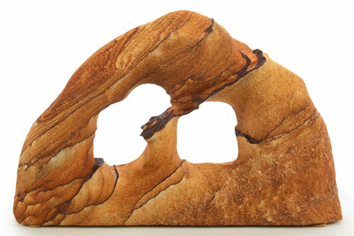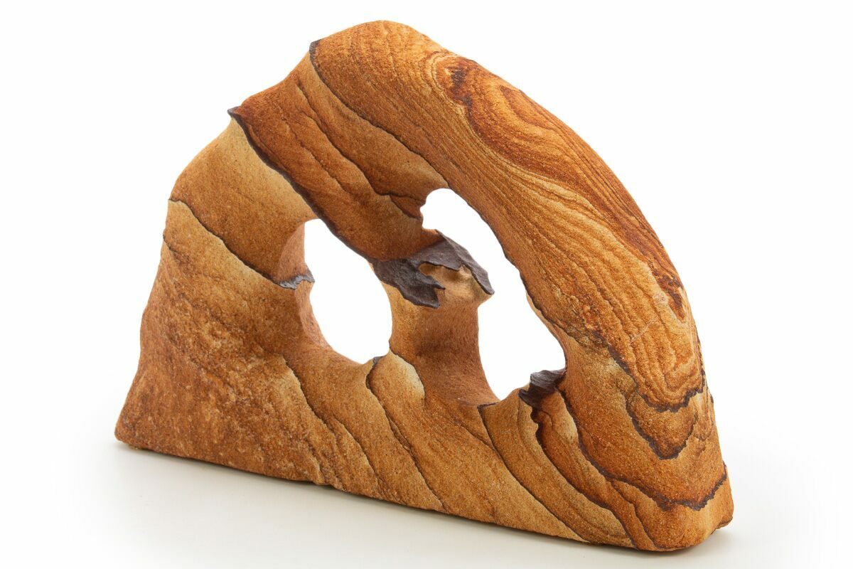 This is a 8.05" wide Toroweap picture sandstone arch. This stunning and distinctive sandstone, mined near Snowflake, Arizona, has been artistically crafted into an arch shape, inspired by natural sandstone formations like Delicate Arch in Arches National Park. The base of this specimen has been cut flat for vertical presentation.