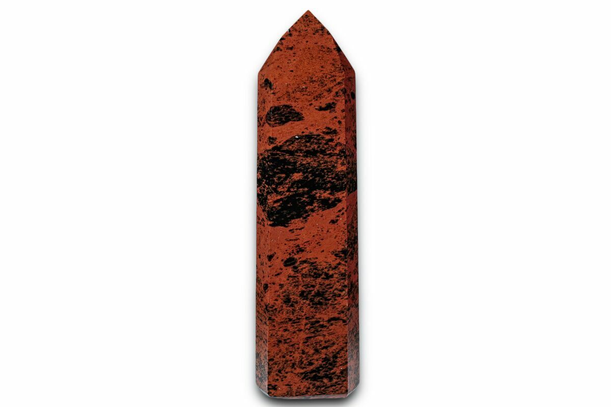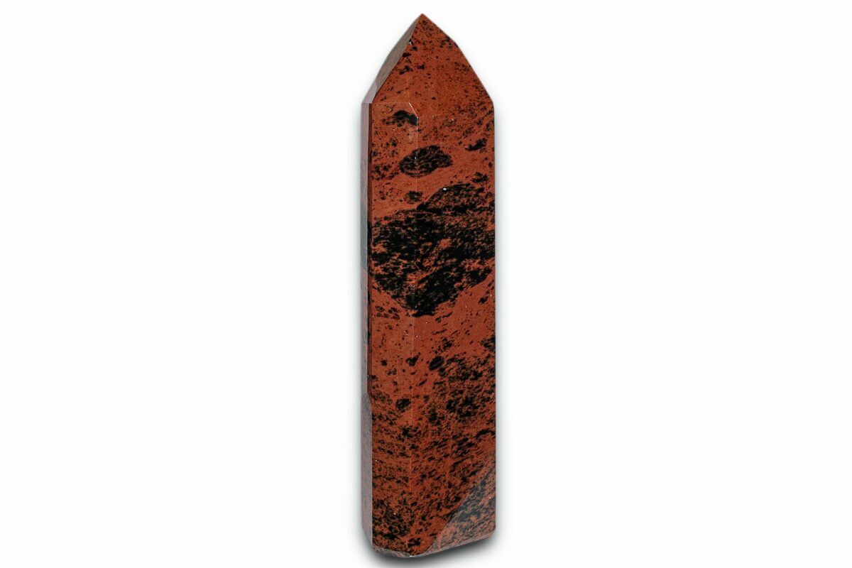 This is a 8.1" tall mahogany obsidian tower, collected from India. This obsidian specimen has been cut and polished, revealing the swirls and streaks of red/orange color that give this form of obsidian its name.