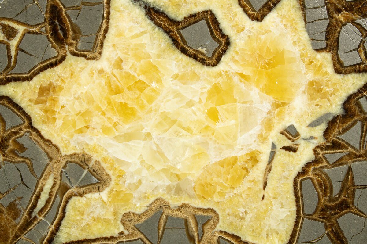This is a beautiful polished slice from a septarian nodule. This septarian was mined West of Orderville, Utah and was deposited during the Late Cretaceous, about 100 million years ago. The contrast between the grey limestone, yellow calcite crystals, and brown aragonite is quite stunning. It has been polished on one side and displays well on the included display stand.