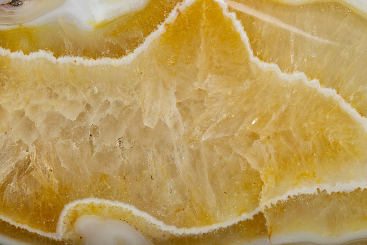 Agate is a variety of microcrystalline quartz (chalcedony) that displays translucence and, in some cases, banding. Agate primarily forms when silica-rich fluids fill pockets within rocks and/or fossils, depositing the silica along the walls of the rock. This process can result in banding patterns, as the compositions and impurities of these depositing fluids change over time. These banding patterns can either form as flat layers, creating linear patterns known as waterline agate, or as rounded layers, forming more common ring-like patterns. These patterns depend on the surfaces available for deposition.