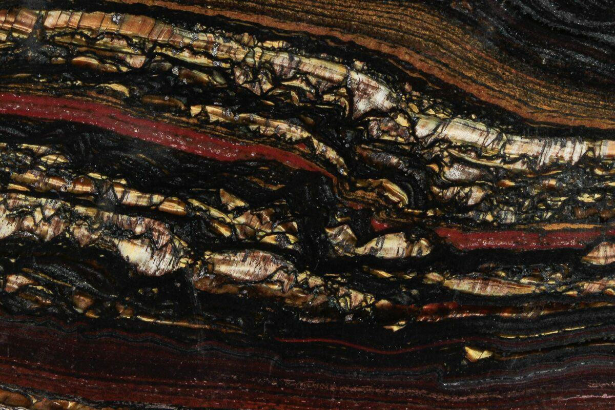 Tiger Iron is composed mainly of tiger's eye, red jasper, and black hematite in an undulating banded pattern. It is mined primarily in two large deposits, one in South Africa and the other in Western Australia. Both deposits are over 2 billion years old!