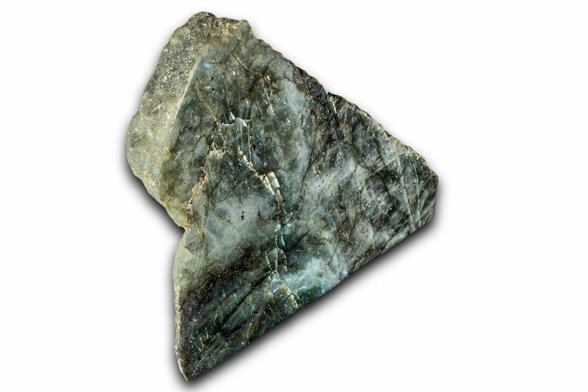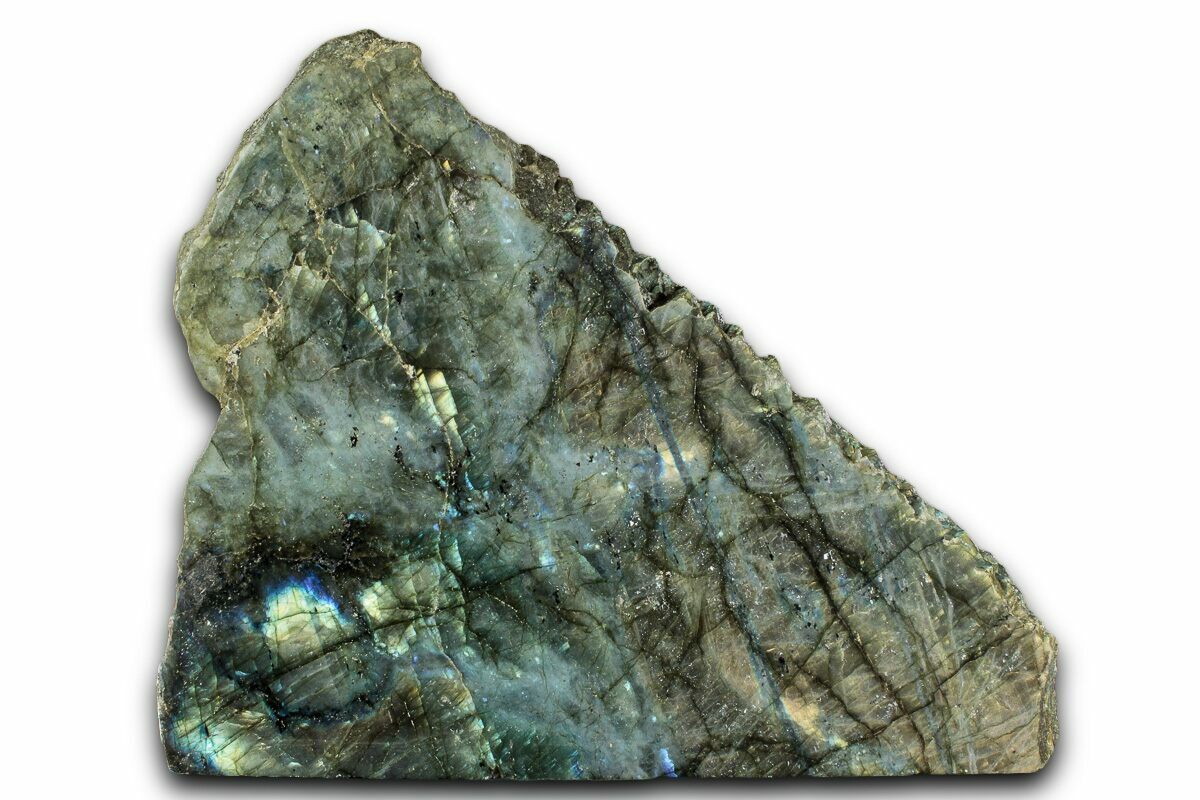 This is a beautiful labradorite specimen with one polished face, collected from Madagascar. The brilliant green, orange, blue, and gold colors have a lot of play in the light, giving the piece an entirely different personality when viewed from different angles and lighting.