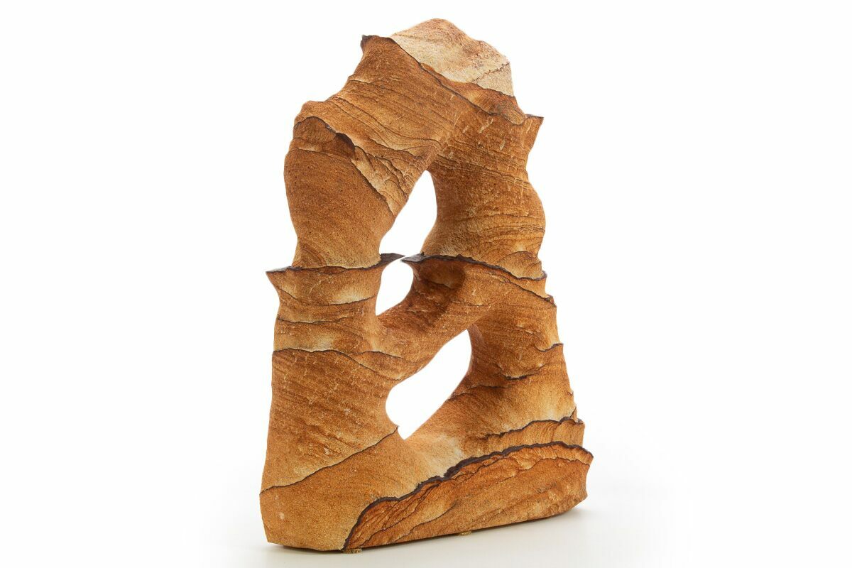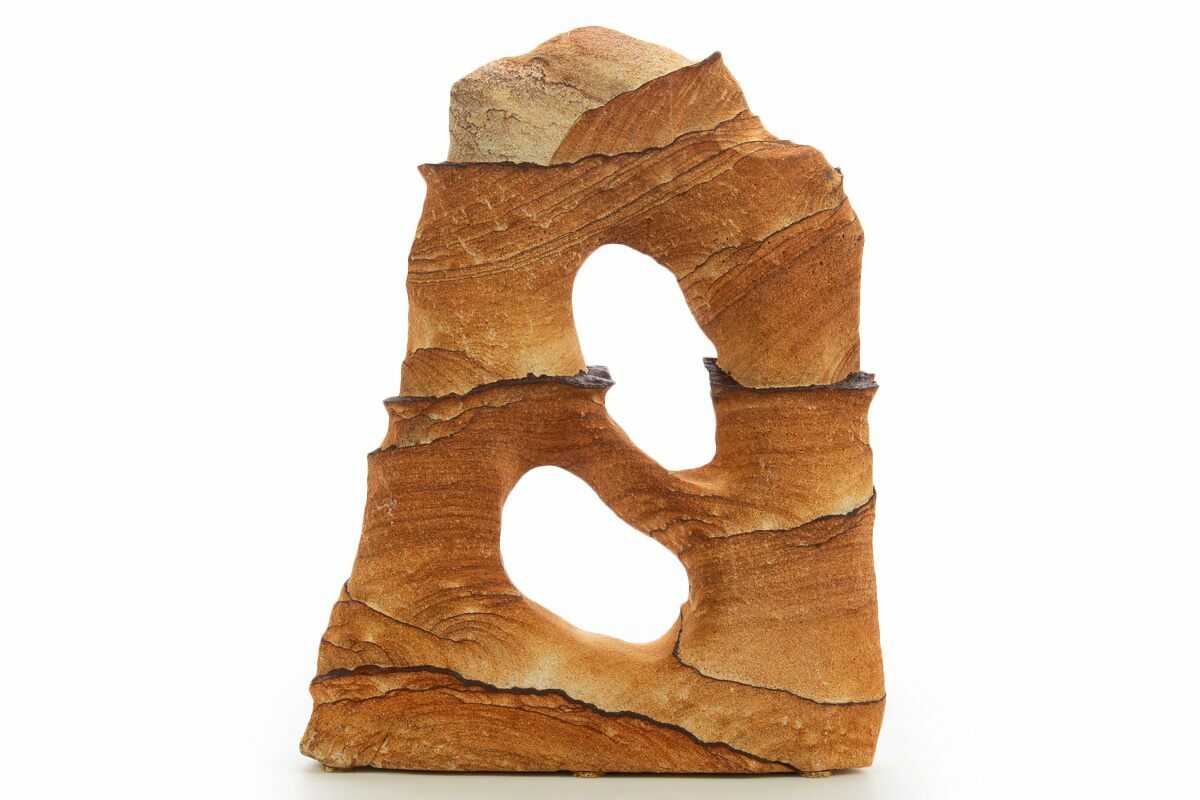 This is a 8.2" tall Toroweap picture sandstone arch. This stunning and distinctive sandstone, mined near Snowflake, Arizona, has been artistically crafted into an arch shape, inspired by natural sandstone formations like Delicate Arch in Arches National Park. The base of this specimen has been cut flat for vertical presentation.