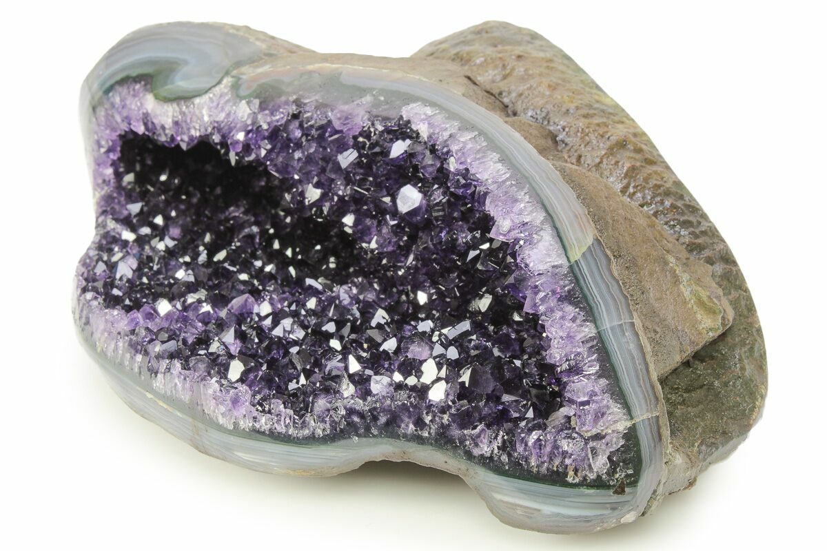 This is a gorgeous, deep-purple amethyst geode, collected from the famed amethyst mines near Artigas, Uruguay. Really nice color in this specimen and the "rind" has been polished to a glossy finish.
