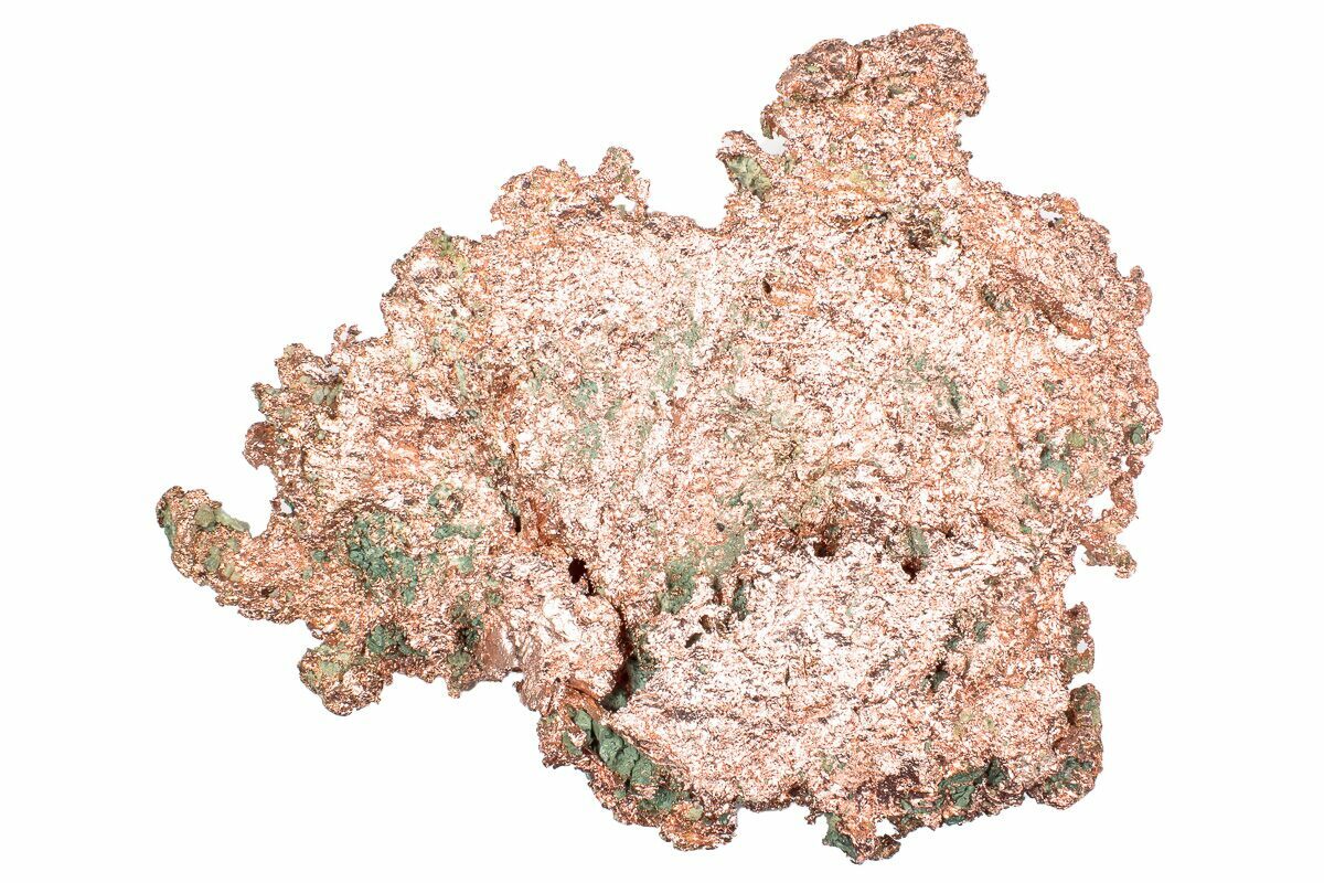Native copper occurs rarely as isometric cubic and octahedral crystals, but more typically as irregular masses and fracture fillings. It has a reddish, orangish, and/or brownish color on fresh surfaces, but typically is weathered and coated with a green tarnish of copper carbonate.