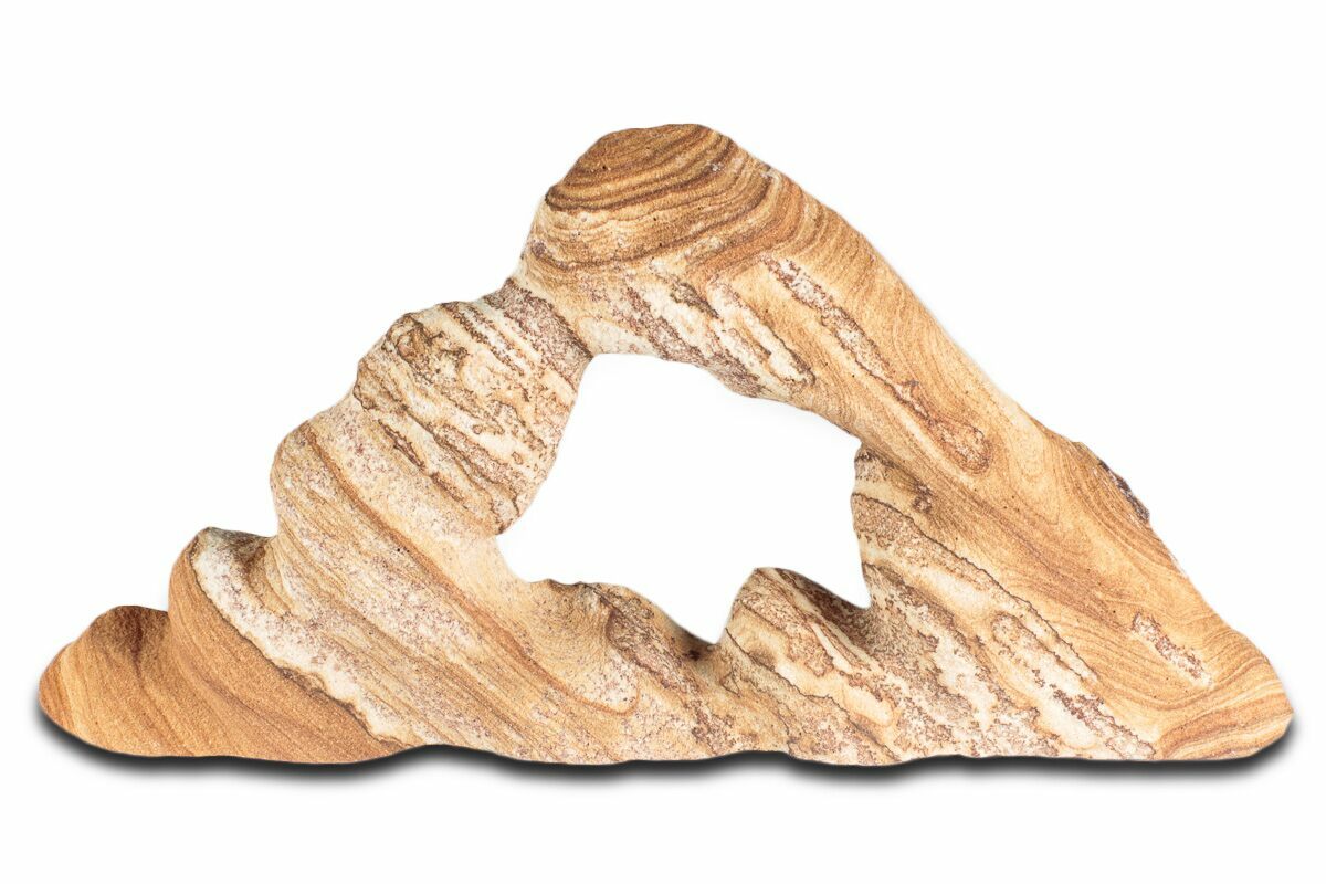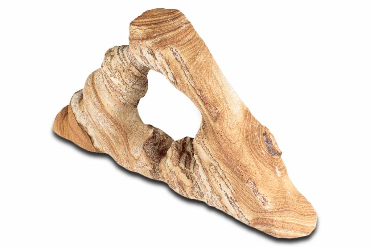 This is a 8.3" wide Toroweap picture sandstone arch. This stunning and distinctive sandstone, mined near Snowflake, Arizona, has been artistically crafted into an arch shape, inspired by natural sandstone formations like Delicate Arch in Arches National Park. The base of this specimen has been cut flat for vertical presentation.