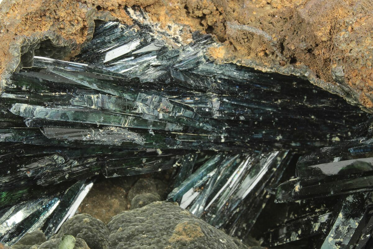 Vivianite is a hydrous iron phosphate mineral that appears in flat, prismatic crystals. This mineral is highly sought after for its deep teal coloring and crisp translucence. It looks like a mystical glass that may be found in a fantasy movie. While it is commonly an iron phosphate mineral, occasionally the iron ion maybe substituted for magnesium, calcium, or manganese.