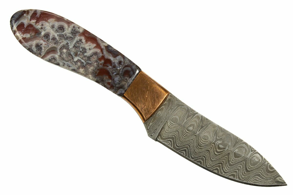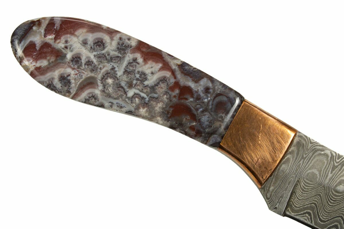 This artistic knife is a stunning showcase of natural beauty and expert craftsmanship. Handcrafted in Utah, it features polished inlays of Mexican lace agate on the handle—an exquisite stone known for its intricate banding and swirling patterns in rich hues of red, orange, cream, and gold. Each inlay is carefully selected and shaped to highlight the stone’s dramatic, lace-like formations, making every knife a truly one-of-a-kind work of art.