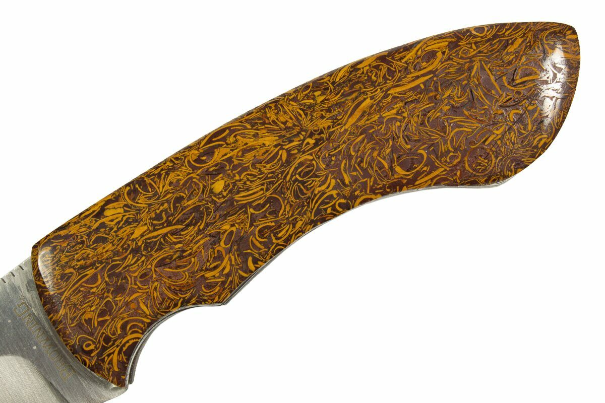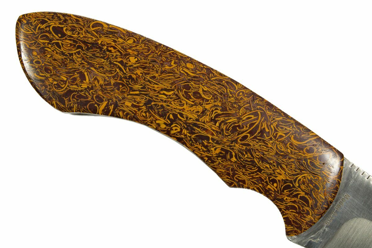 This artistic knife is a striking fusion of natural beauty and fine craftsmanship. Handcrafted in Utah, it features polished inlays of Miriam Stone on the handle—a unique sedimentary rock from India known for its bold, swirling patterns of deep red, brown, and cream. Formed over millions of years from fossilized shells and ancient seabeds, Miriam Stone gives the handle a rich, organic texture that turns this knife into a true work of art.