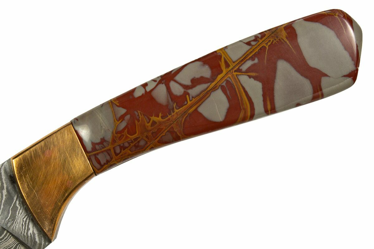 This artistic knife is a breathtaking blend of natural elegance and masterful craftsmanship. Handcrafted in Utah, it features striking inlays of Noreena Jasper on the handle—a vibrant gemstone from Western Australia known for its bold red, mustard, and gray patterns that resemble abstract paintings formed by nature itself. Each piece of jasper is carefully cut and polished to highlight its dramatic, fractured patterns, making every knife a unique visual masterpiece.
