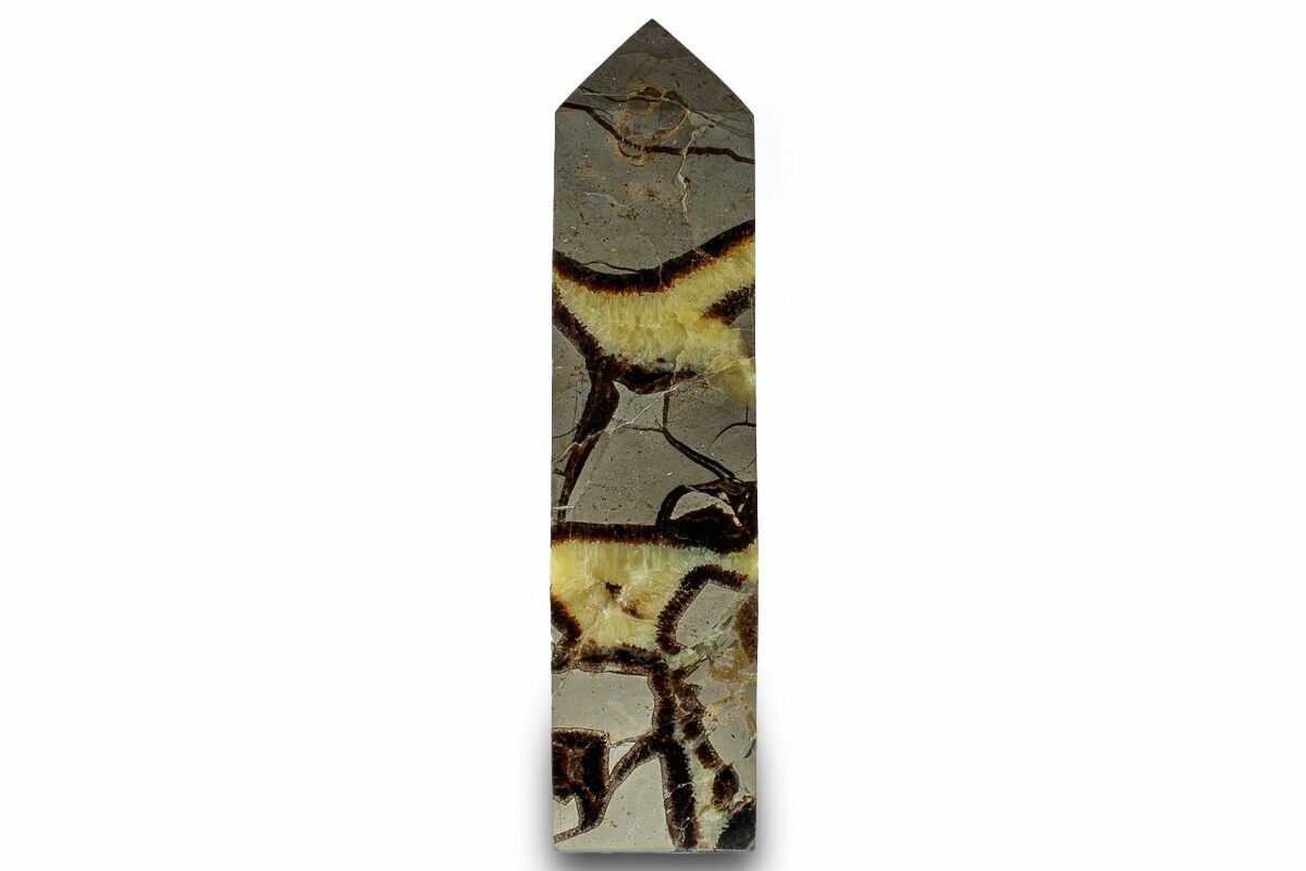 This is a beautiful, cut/polished Septarian obelisk. The base has been cut flat so that it stands up nicely on a flat surface. The septarian comes from the Betsiboka Region of Madagascar and was deposited during the Jurassic period.