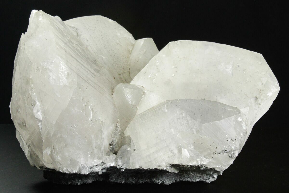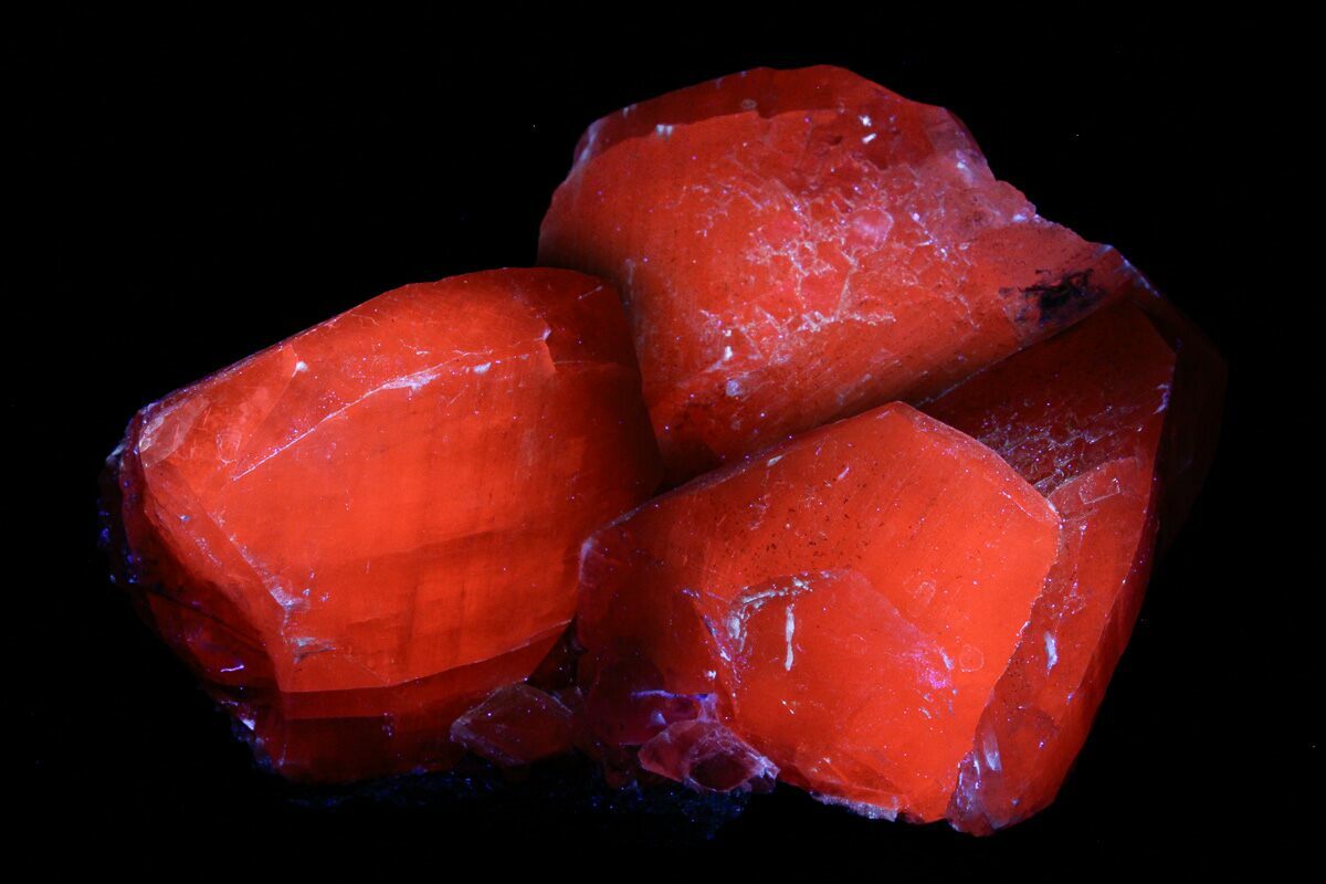 This spectacular, 8.5" wide cluster of calcite crystals from Hunan Province, China features multiple large, well-formed crystals with noticeable striations running along their faces, reflecting their natural growth patterns. When placed under shortwave ultraviolet light, the calcite exhibits an orange fluorescence, adding an eye-catching display to the specimen. The combination of strong crystal form, textured surfaces, and sheer crystal size makes this an attractive example.