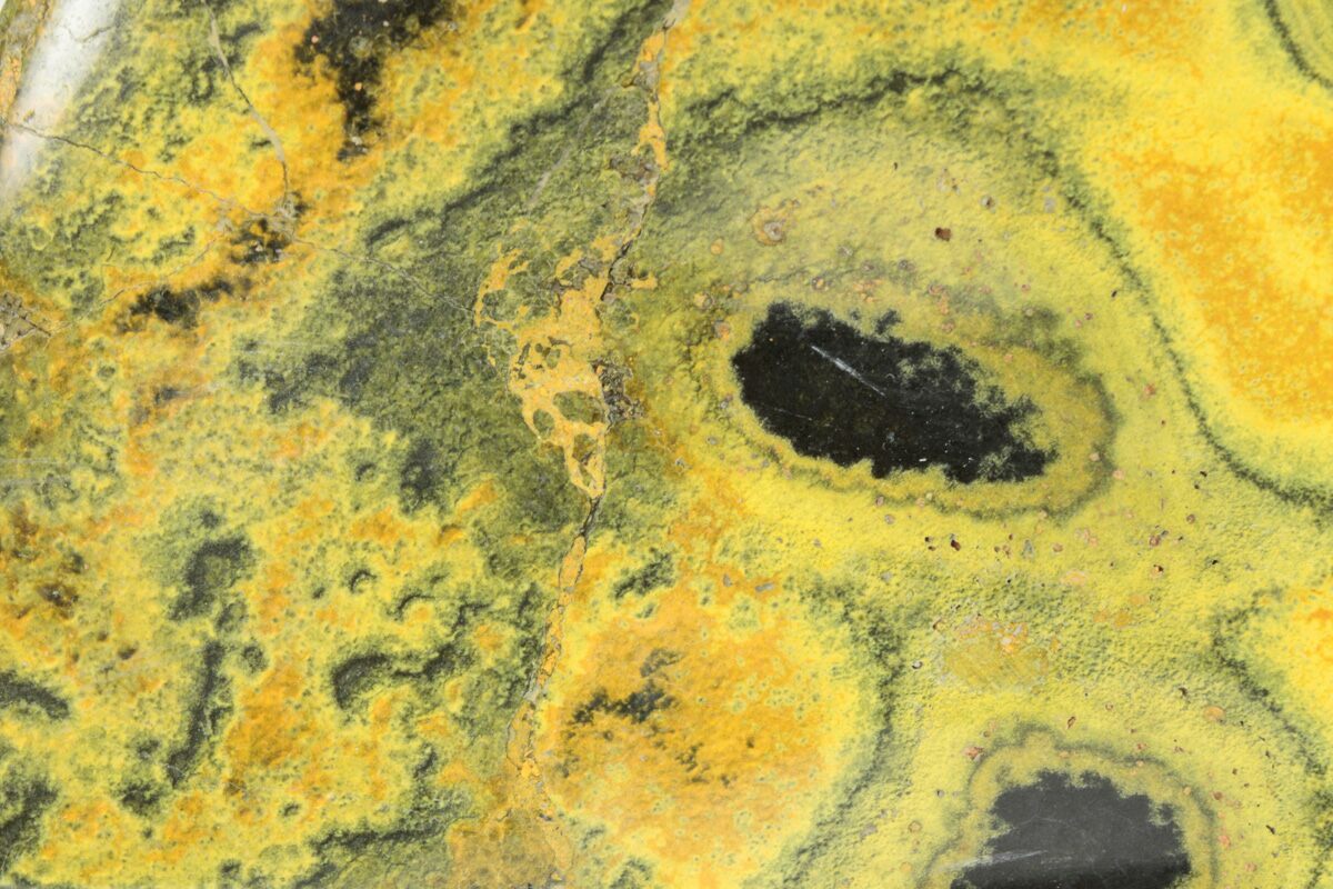 Bumblebee jasper is the trade name for a vibrantly colored, fibrous calcite mined exclusively from Mount Papandayan in Indonesia. It is has very distinctive yellow, orange, and black banding resembling the color patterns of a bumblebee, hence the name. The orange and yellow colors are mainly caused by finely dispersed realgar while the black bands are caused by pyrite. Technically it is not a jasper, as it is primarily calcite and contains very little silica.