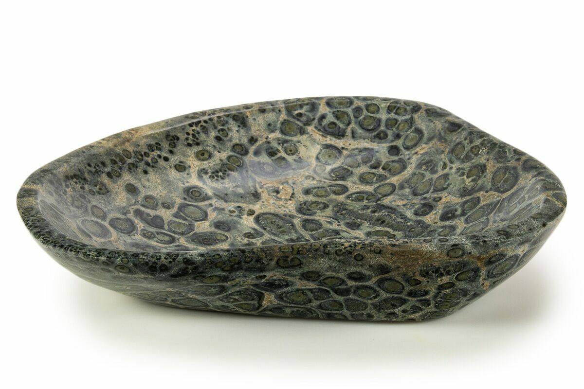 This is a gorgeous, hand polished bowl made from Kambaba jasper found in Madagascar. It is 8.6" wide and has dark circular mineral formations throughout the "jasper".