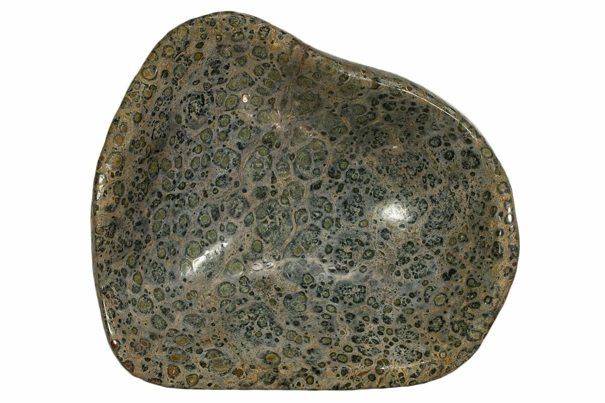 This is a gorgeous, hand polished bowl made from Kambaba jasper found in Madagascar. It is 8.6" wide and has dark circular mineral formations throughout the "jasper".