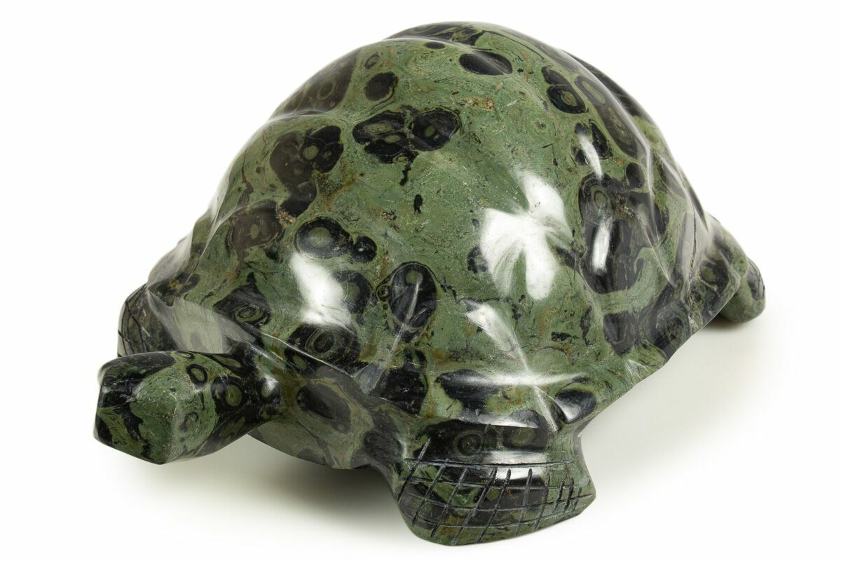 This is an 8.6" long tortoise sculpted from from kambaba jasper found in Madagascar. It has been meticulously shaped and polished to create this unique piece. Grooves were cut into the "shell" to give the shell scutes. This piece has dark circular mineral formations throughout the green matrix.