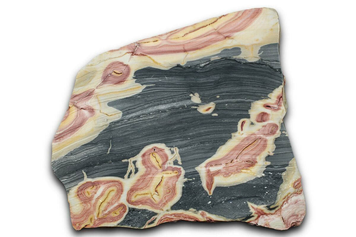 This is a beautiful 8.6" wide polished slab of "windy mountain jasper", collected from an abandoned gold mine in Nevada. It displays a colorful mixture pastel red, orange, yellow, and grey hues. The specimen has been cut flat and polished to a glossy finish on one side.