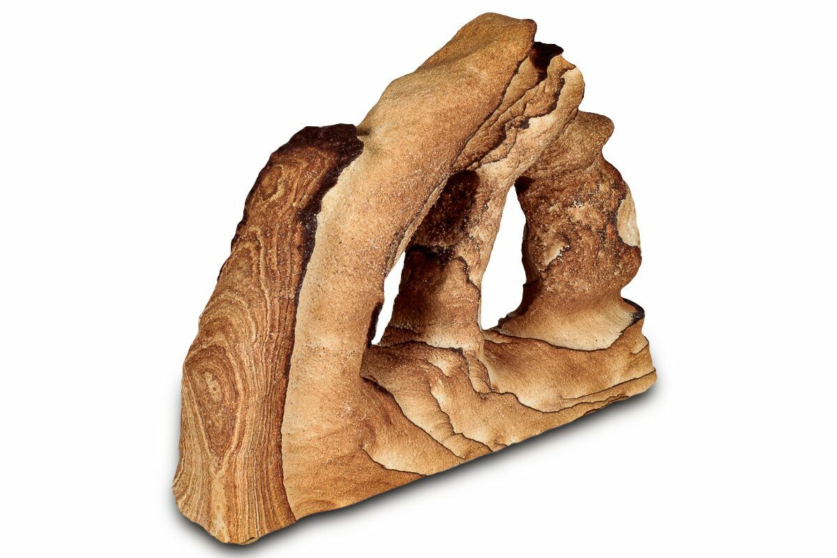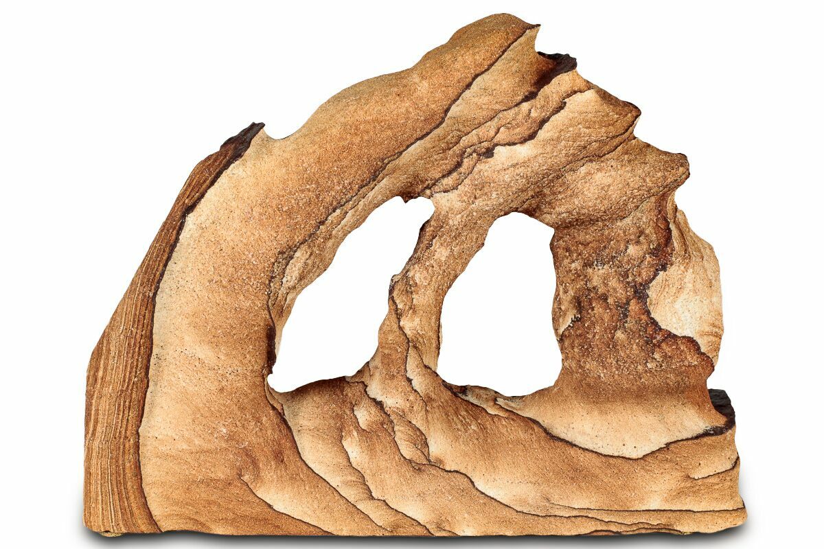 This is a 8.6" wide Toroweap picture sandstone arch. This stunning and distinctive sandstone, mined near Snowflake, Arizona, has been artistically crafted into an arch shape, inspired by natural sandstone formations like Delicate Arch in Arches National Park. The base of this specimen has been cut flat for vertical presentation.