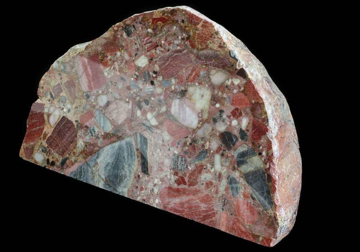 This is a large section of brecciated chert, collected from the Pinyalling Hills in the midwest region of Western Australia. The face has been polished to a mirror like finish, and the base is has been cut for aesthetic presentation. Chert breccia consists of innumerable angular fragments of assorted rock types. The dominant rock types associated in the mix are quartz, jasper and chert.