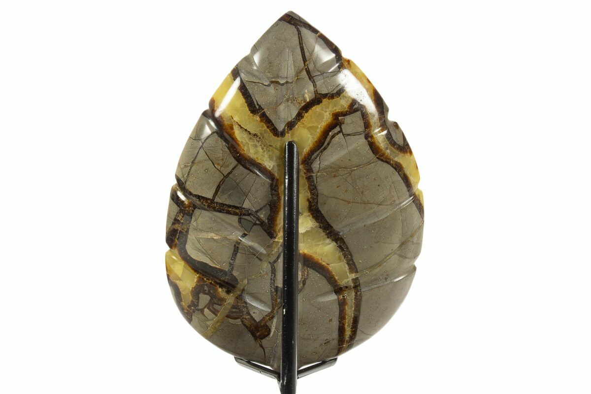 This is an absolutely gorgeous hand polished leaf made from septarian collected in Madagascar. The contrast between the grey limestone, yellow calcite, and brown aragonite is quite stunning. It measures 8.7" long and has been sculpted into the shape of a leaf. It sits upright beautifully on the accompanied metal and wood display stand.
