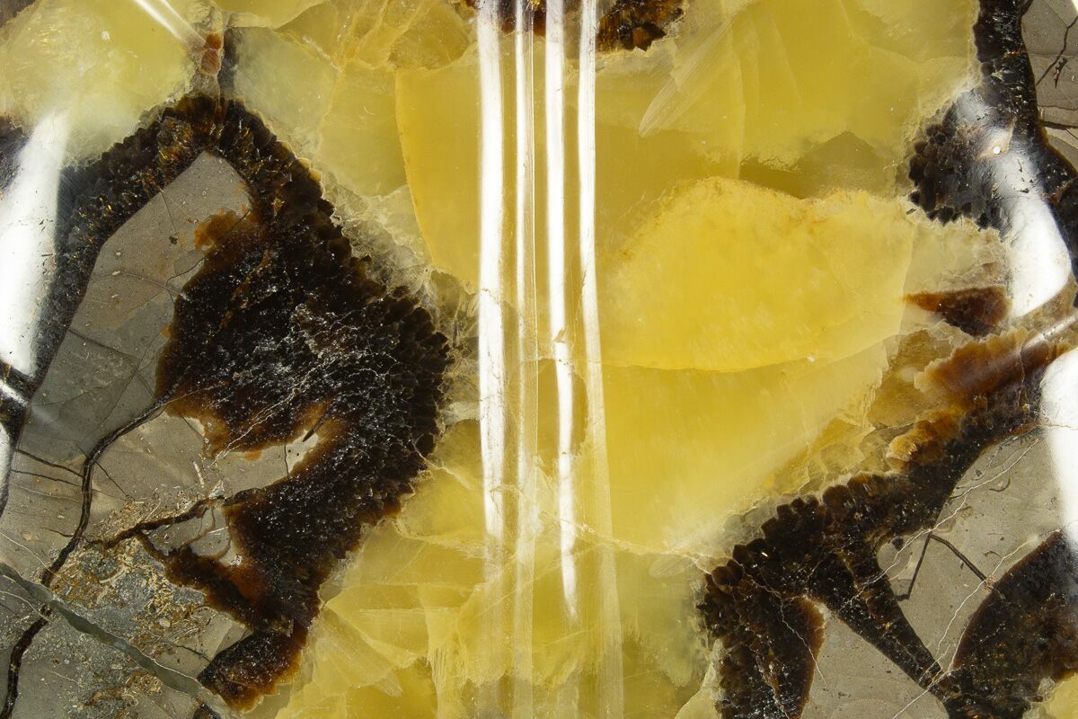 The cracks in the concretions are then filled in with minerals such as calcite (yellow), aragonite (brown), and sometimes pyrite, causing very interesting patterns. They have often been described as looking like dragon's skin. They are frequently found as geodes with hollow, calcite crystal-filled cavities. More rarely, the fossils that originally started the formation of the concretion are still preserved in the septarian.