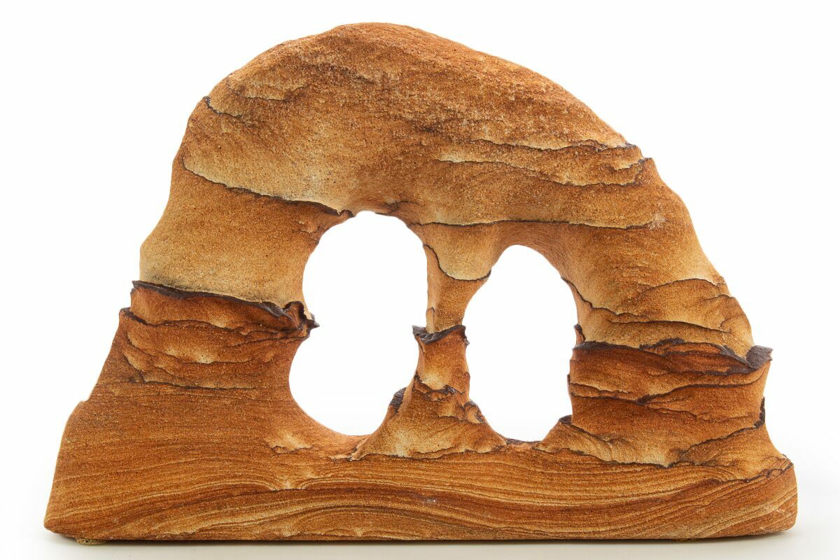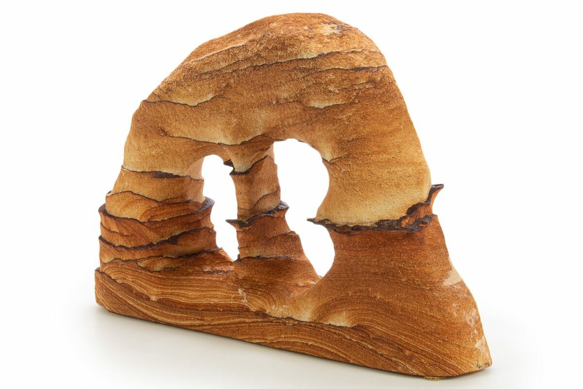 This is a 8.7" wide Toroweap picture sandstone arch. This stunning and distinctive sandstone, mined near Snowflake, Arizona, has been artistically crafted into an arch shape, inspired by natural sandstone formations like Delicate Arch in Arches National Park. The base of this specimen has been cut flat for vertical presentation.