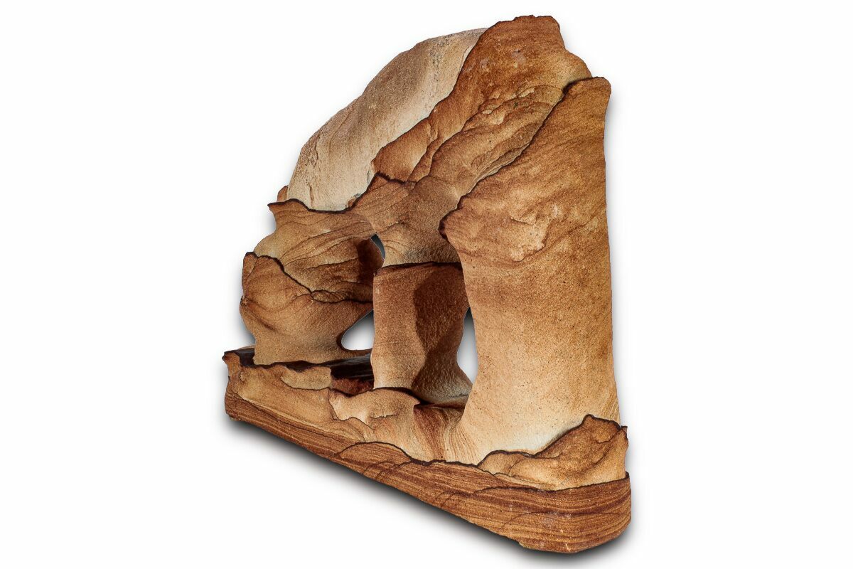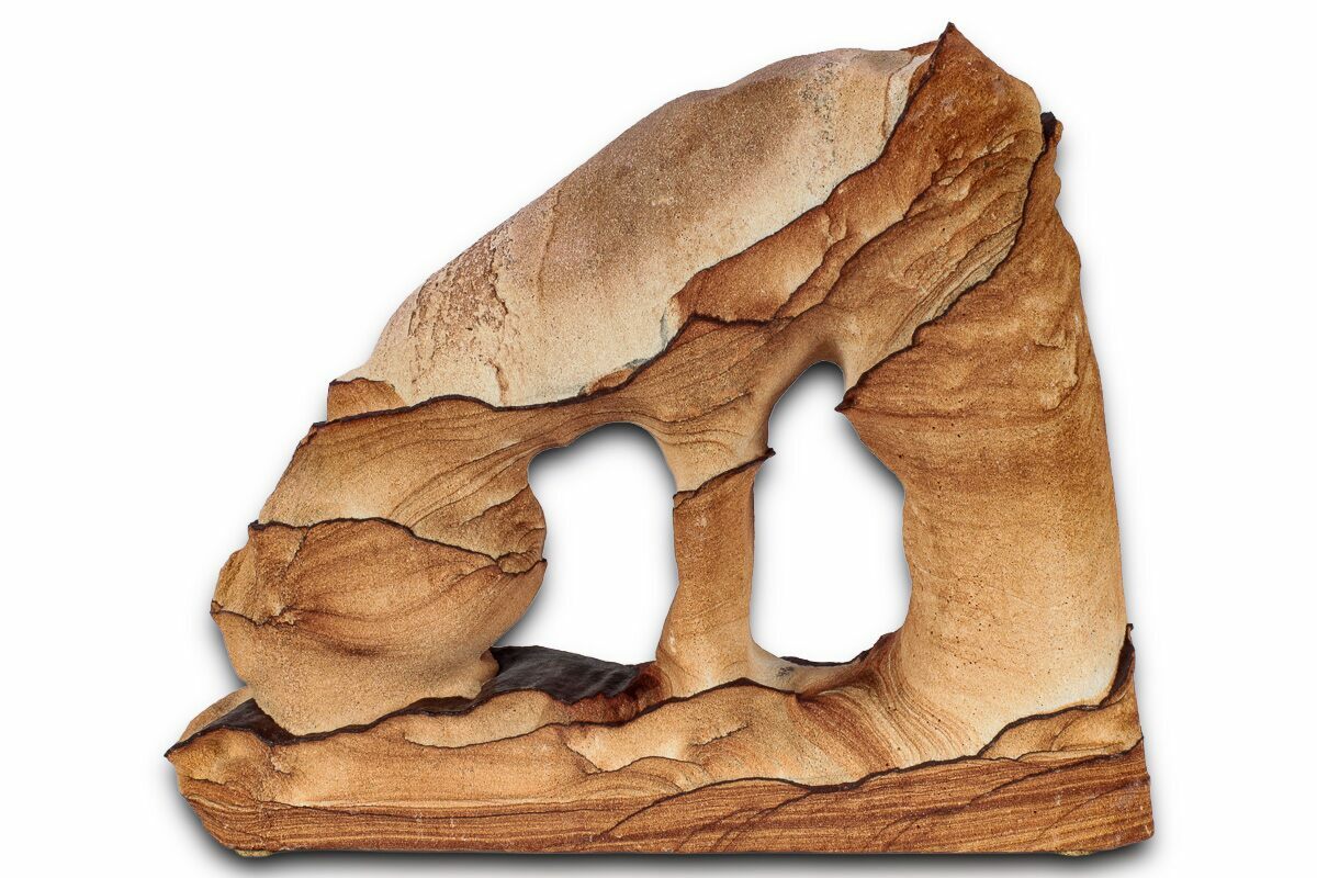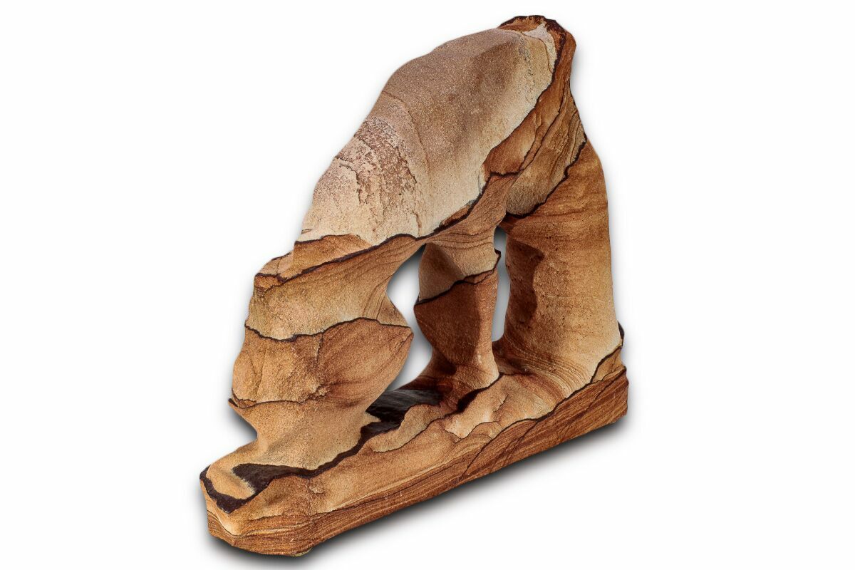 This is a 8.7" wide Toroweap picture sandstone arch. This stunning and distinctive sandstone, mined near Snowflake, Arizona, has been artistically crafted into an arch shape, inspired by natural sandstone formations like Delicate Arch in Arches National Park. The base of this specimen has been cut flat easy display.