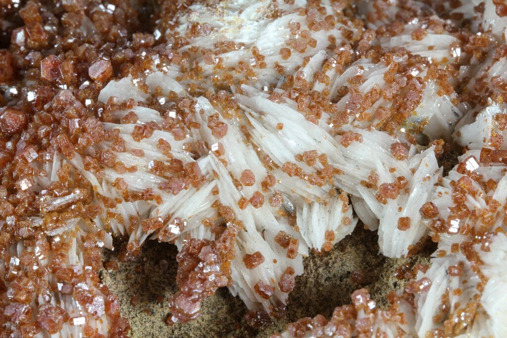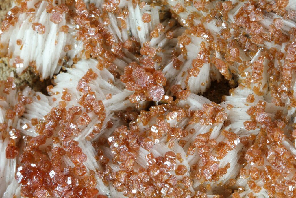 Vanadinite from Morocco is world-famous for producing some of the finest red crystal specimens on the planet. In the arid hills surrounding Mibladen and Taouz, vanadinite forms as vibrant clusters of hexagonal prisms, often with a deep crimson to orange-red color that seems to glow against the pale desert matrix. These crystals typically develop in dense groups, coating barite blades or covering weathered limestone with dazzling, glassy faces and sharp geometric symmetry. The dryness of the region and the slow oxidation of ancient lead deposits create the perfect geochemical environment for vanadinite to grow with exceptional clarity, luster, and intensity of color. Moroccan vanadinite is highly prized by collectors for its bold aesthetics, architectural crystal formations, and the consistent quality that has made these localities the global benchmark for the species.