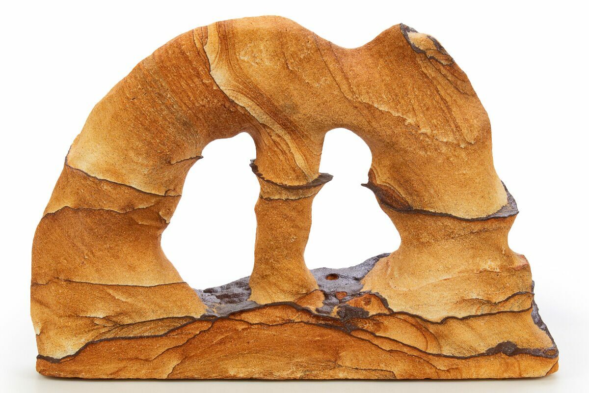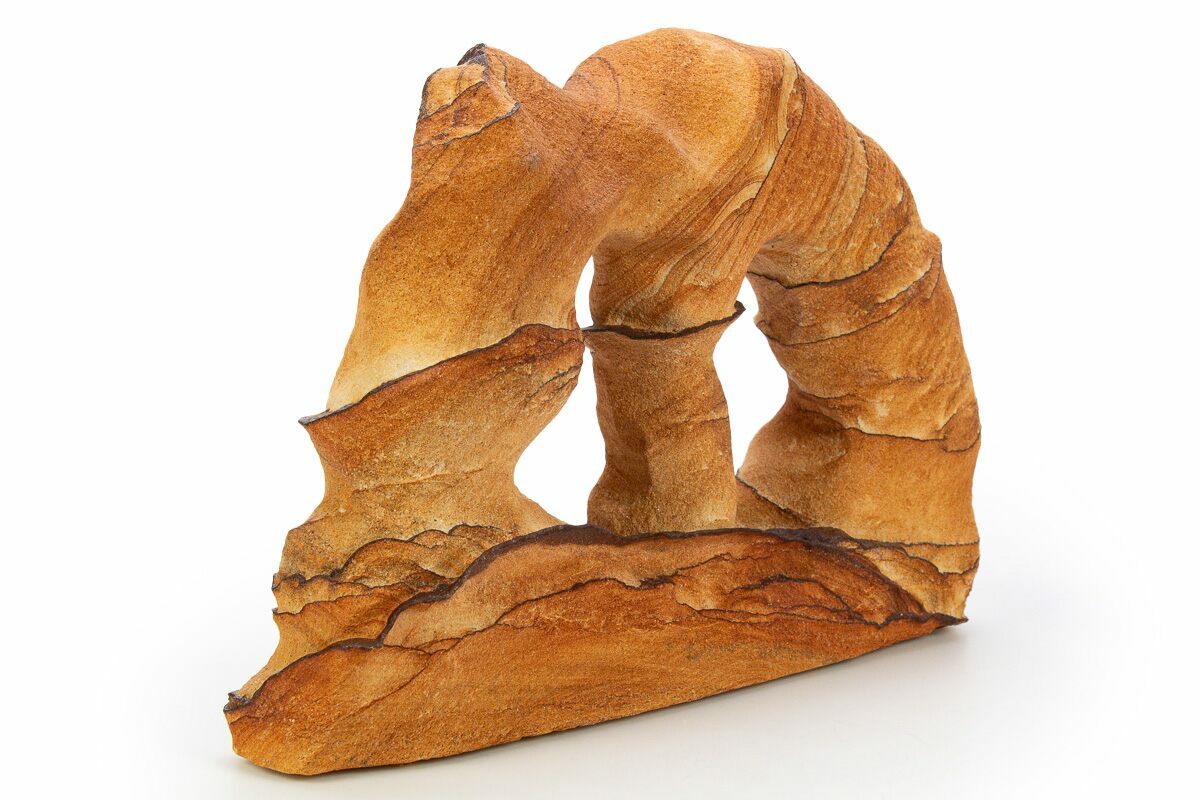This is a 8.8" wide Toroweap picture sandstone arch. This stunning and distinctive sandstone, mined near Snowflake, Arizona, has been artistically crafted into an arch shape, inspired by natural sandstone formations like Delicate Arch in Arches National Park. The base of this specimen has been cut flat for vertical presentation.