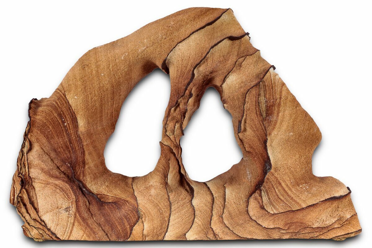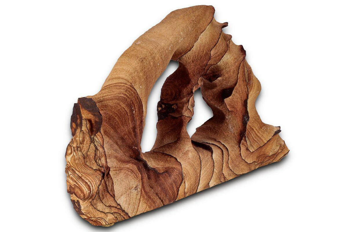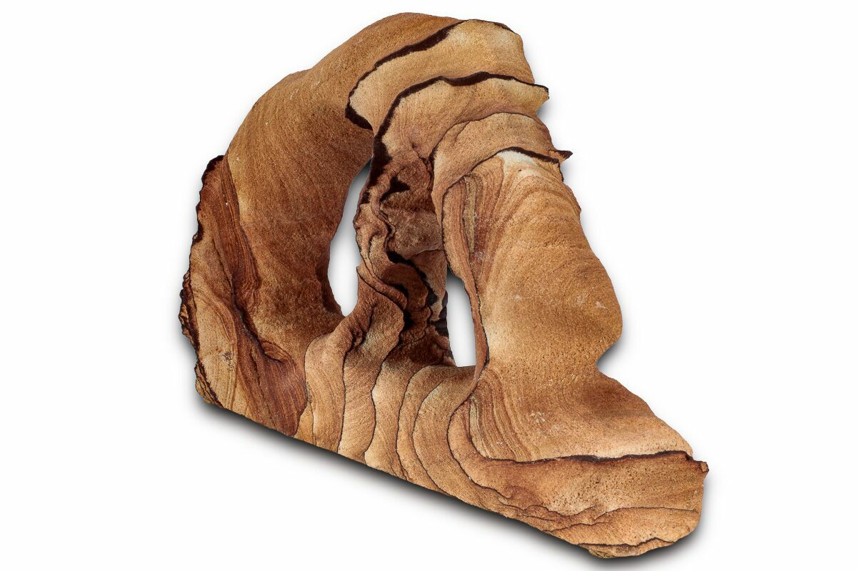 This is a 8.8" wide Toroweap picture sandstone arch. This stunning and distinctive sandstone, mined near Snowflake, Arizona, has been artistically crafted into an arch shape, inspired by natural sandstone formations like Delicate Arch in Arches National Park. The base of this specimen has been cut flat easy display.