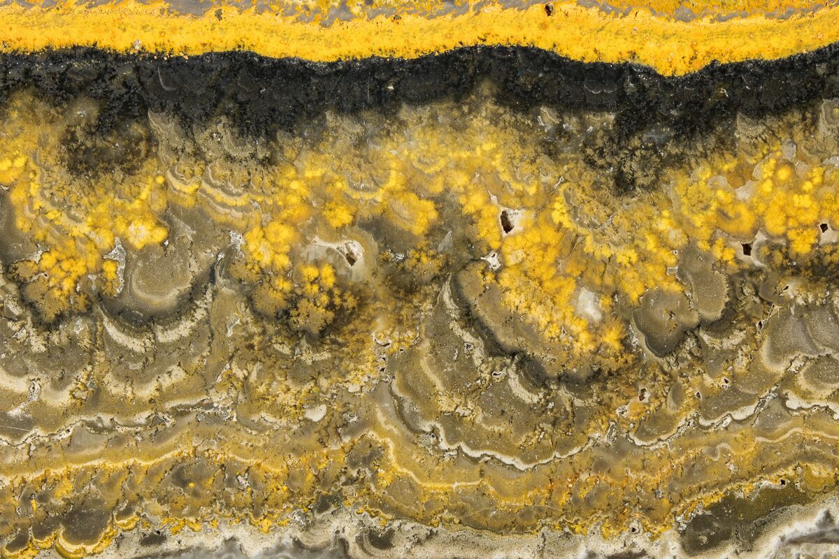 Bumblebee jasper is the trade name for a vibrantly colored, fibrous calcite mined exclusively from Mount Papandayan in Indonesia. It is has very distinctive yellow, orange, and black banding resembling the color patterns of a bumblebee, hence the name. The orange and yellow colors are mainly caused by finely dispersed realgar while the black bands are caused by pyrite. Technically it is not a jasper, as it is primarily calcite and contains very little silica.