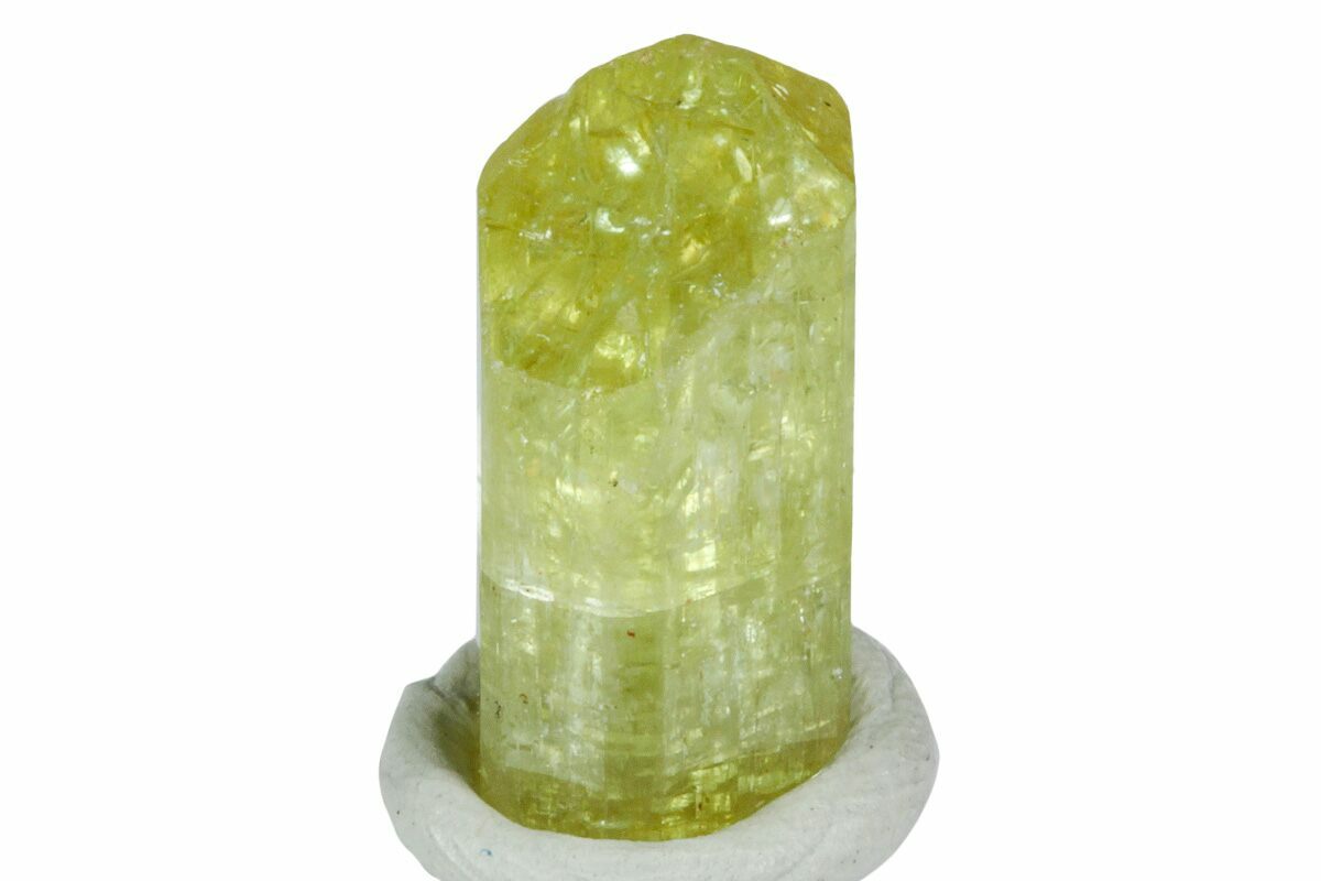 This is a lustrous, greenish-yellow apatite crystal with a nice termination from Imilchil, Morocco. It has been mounted to a display base with mineral tack.