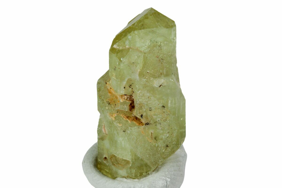 This is a lustrous, greenish-yellow apatite crystal with a nice termination from Imilchil, Morocco. It has been mounted to a display base with mineral tack.