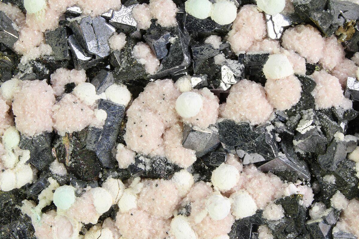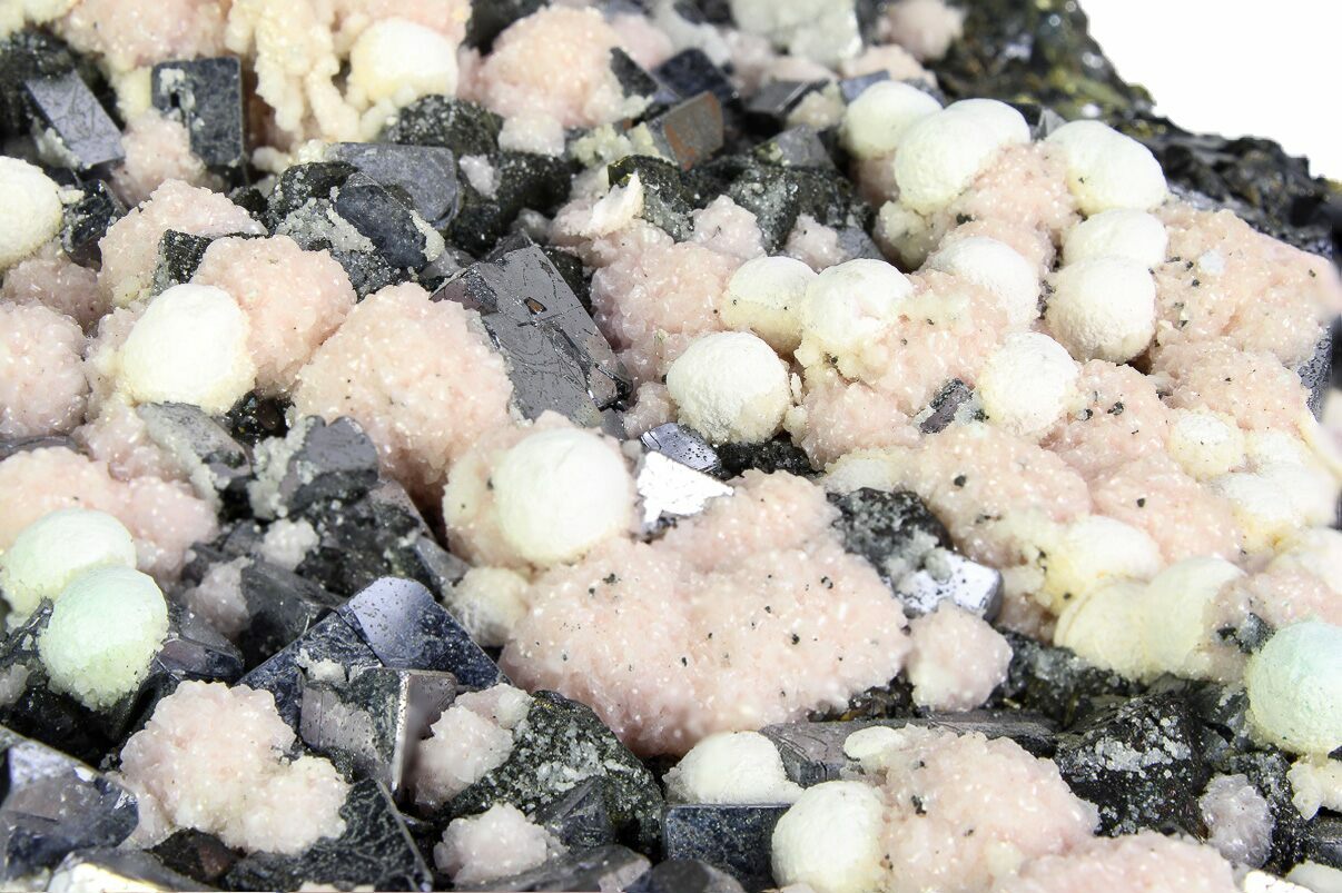 This is a breathtaking mineral specimen featuring aggregations of light pink rhodochrosite that formed over lustrous cubic galena crystals, black sphalerite, and brassy chalcopyrite. The white botryoidal formations appear to be aragonite, though it's tough to tell for sure. The specimen comes out of Peru and measures 8" wide.