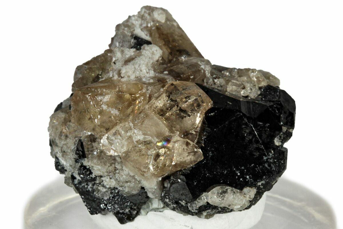 This is a champagne topaz cluster with black/brown bixbyite, collected from the Thomas Range of Utah. The crystals are still attached to a portion of matrix and the entire specimen measures .8" wide.