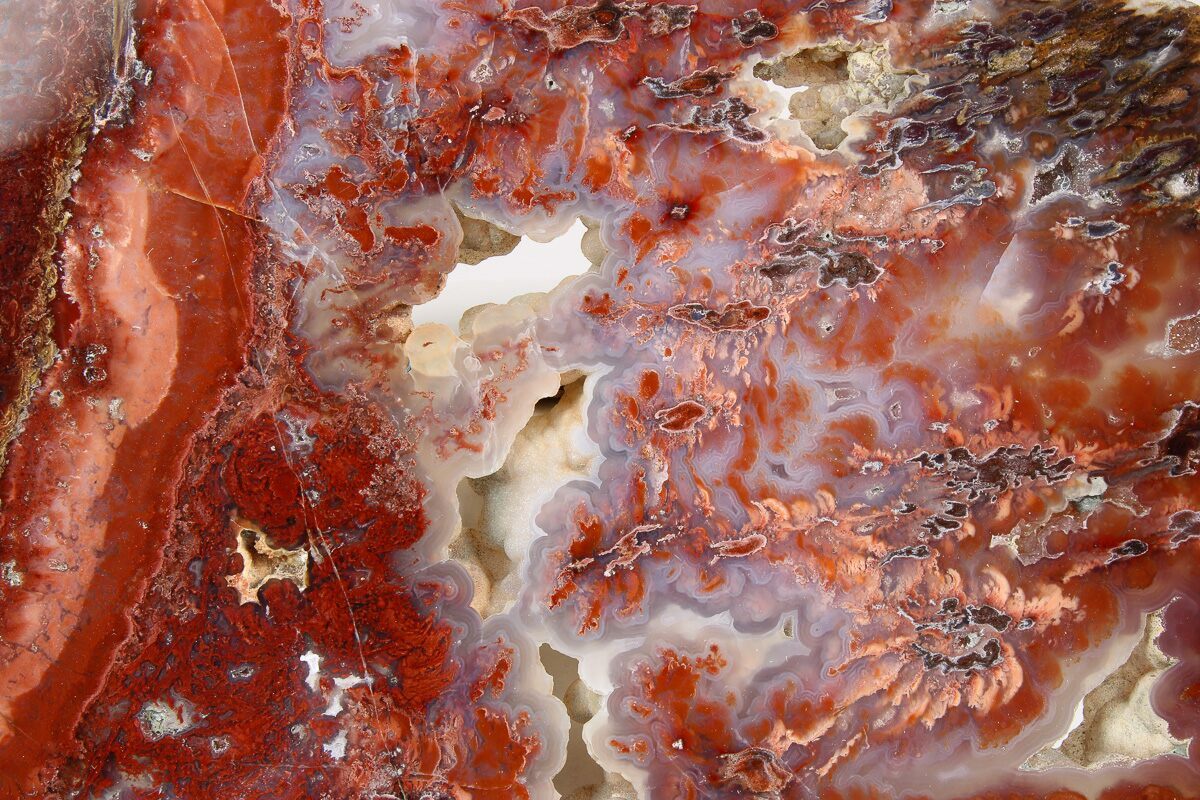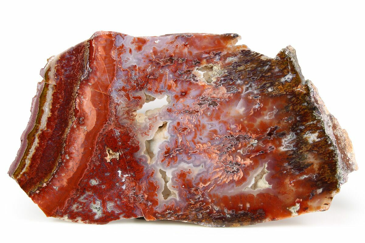 This is a gorgeous slab of Cady Mountain (Sicat) Plume Agate that was collected from the Cady Mountains in the Mojave Desert of San Bernadino County, California. It features fascinating and colorful agate formations. There are pockets of red and white-blue agate, some of which contain druzy quartz and botryoidal agate lined cavities.