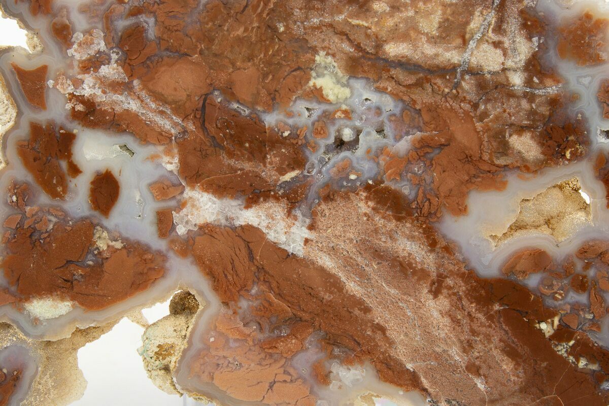 This is a 8" wide polished slab of youngite that was collected near Guernsey in Platte County, Wyoming. Youngite is a brecciated jasper that is often found encrusted in chalcedony. Under shortwave UV, this agate fluoresces a white-blue color.