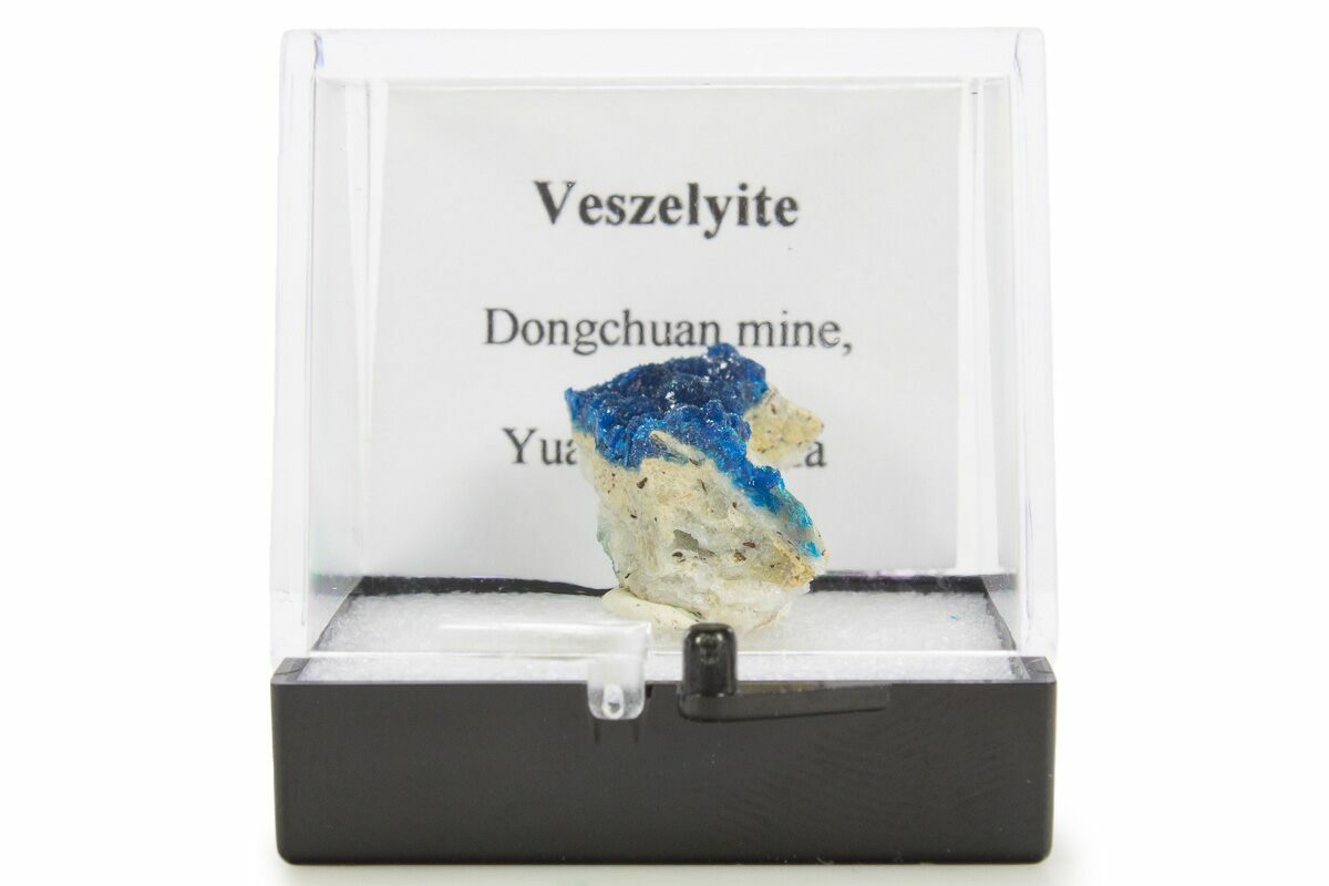 This is a beautiful, .8" wide cluster of vibrant blue veszelyite crystals, collected from the Dongchuan Cu Mine in the Yunnan, China.