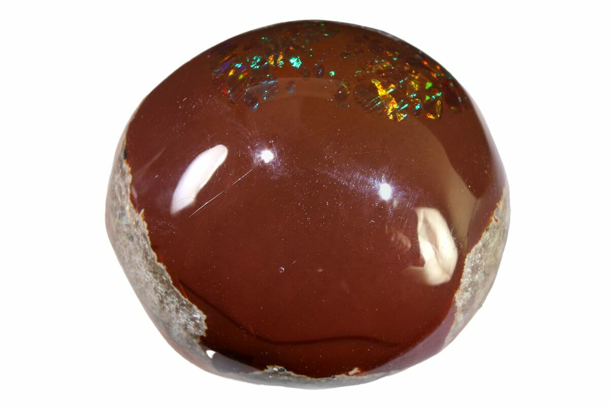 This is a gorgeous, .85" wide Ethiopian chocolate opal nodule from the Mezezo Opal Occurrence in Ethiopia. These opal nodules exhibit eye-catching flash and have been split and polished to a glossy finish. This specimen features a dancing play of color that flitters between purple, red, green, and orange. Pictures simply can't do justice to the beauty of this opal.