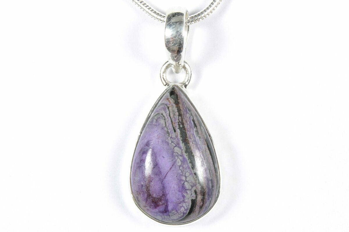 This is an eye-catching sugilite pendant featuring a polished sugilite stone set in 925 sterling silver. The pendant itself is .85" tall (including loop). A 24" silver plated snake chain with a lobster clasp is included with the pendant. You will receive the exact pendant pictured.