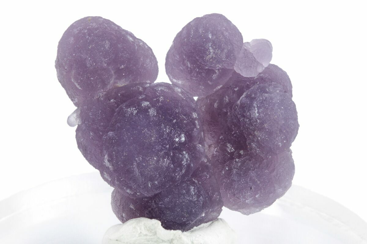 This is a high-quality, sparkling, purple grape agate specimen from Sulawesi, Indonesia. It shows purple chalcedony formations and a botryoidal structure from which it earned its name. The specimen has been mounted to an acrylic display base with mineral tack for museum-quality display.
