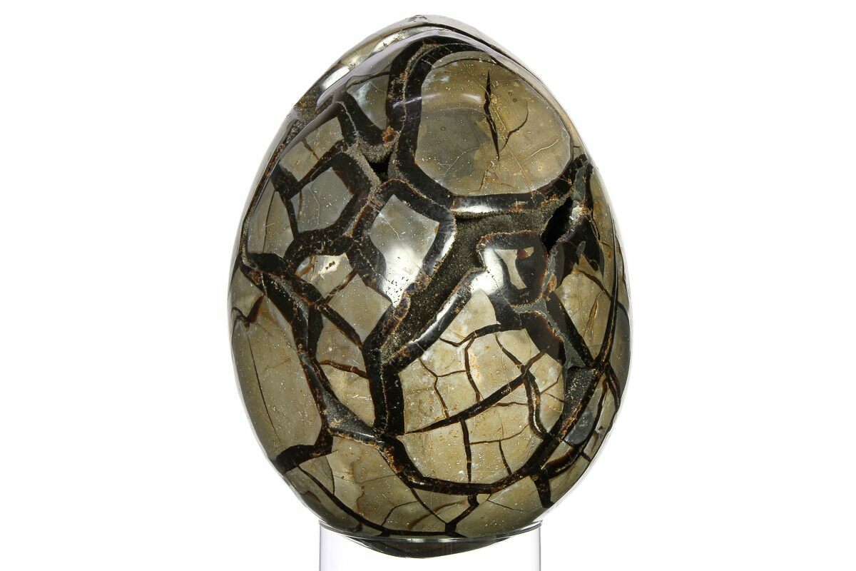 This is a polished septarian geode collected from the Betsiboka Region of Madagascar. The hollow cavity is full of shimmering, black calcite crystals and the exterior has been shaped and polished into the shape of an egg with a glossy finish. A removable "puzzle piece" allows the interior, crystal filled cavity to be viewed.